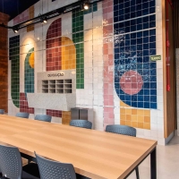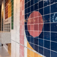 The industrial cantina project, designed by Carla Career, has transformed an industrial-style space into a modern and welcoming place, where functionality merges with aesthetics. To bring this vision to life, the architect designed a custom mosaic using a total of 5,000 tile pieces, creating a unique composition tailored to the project's needs.