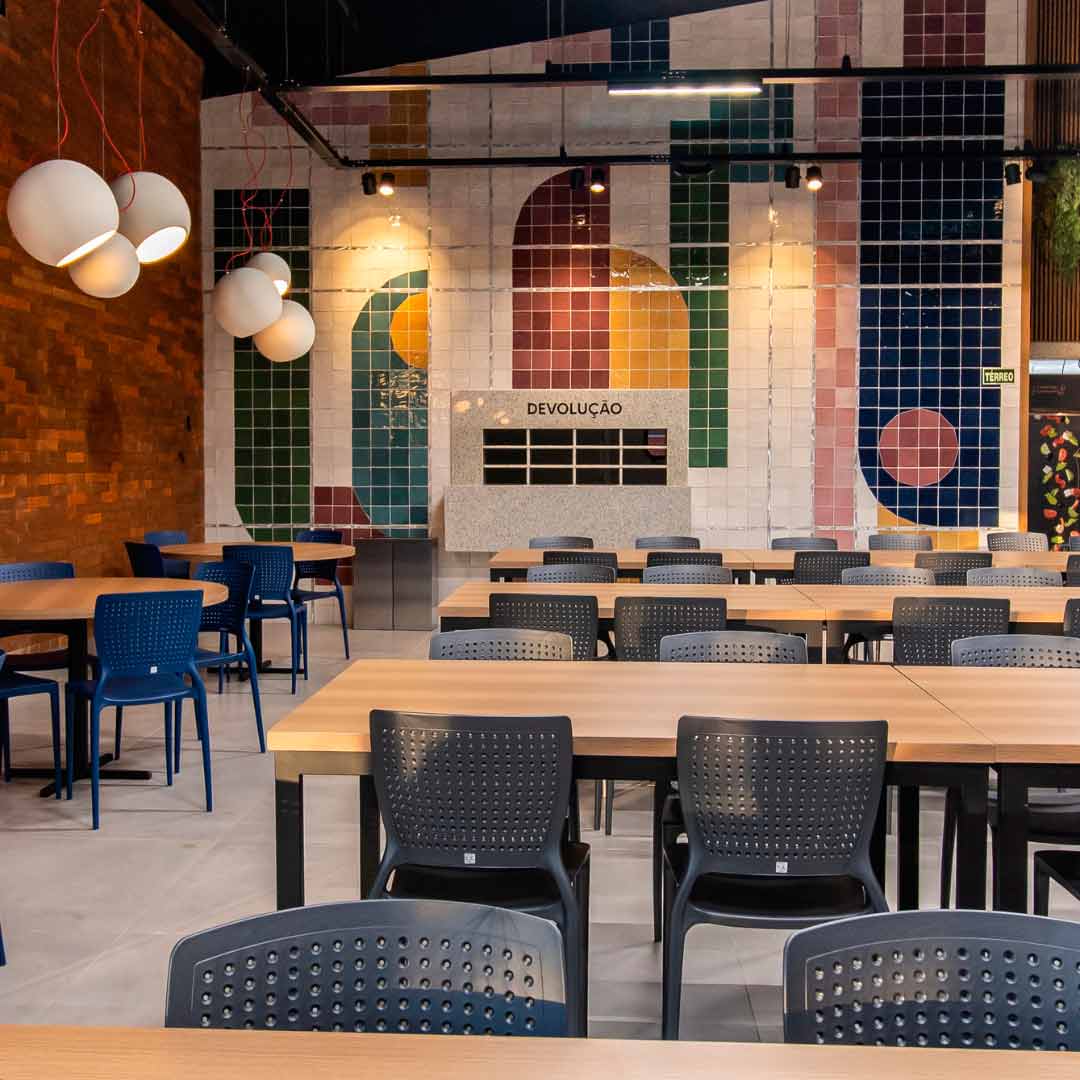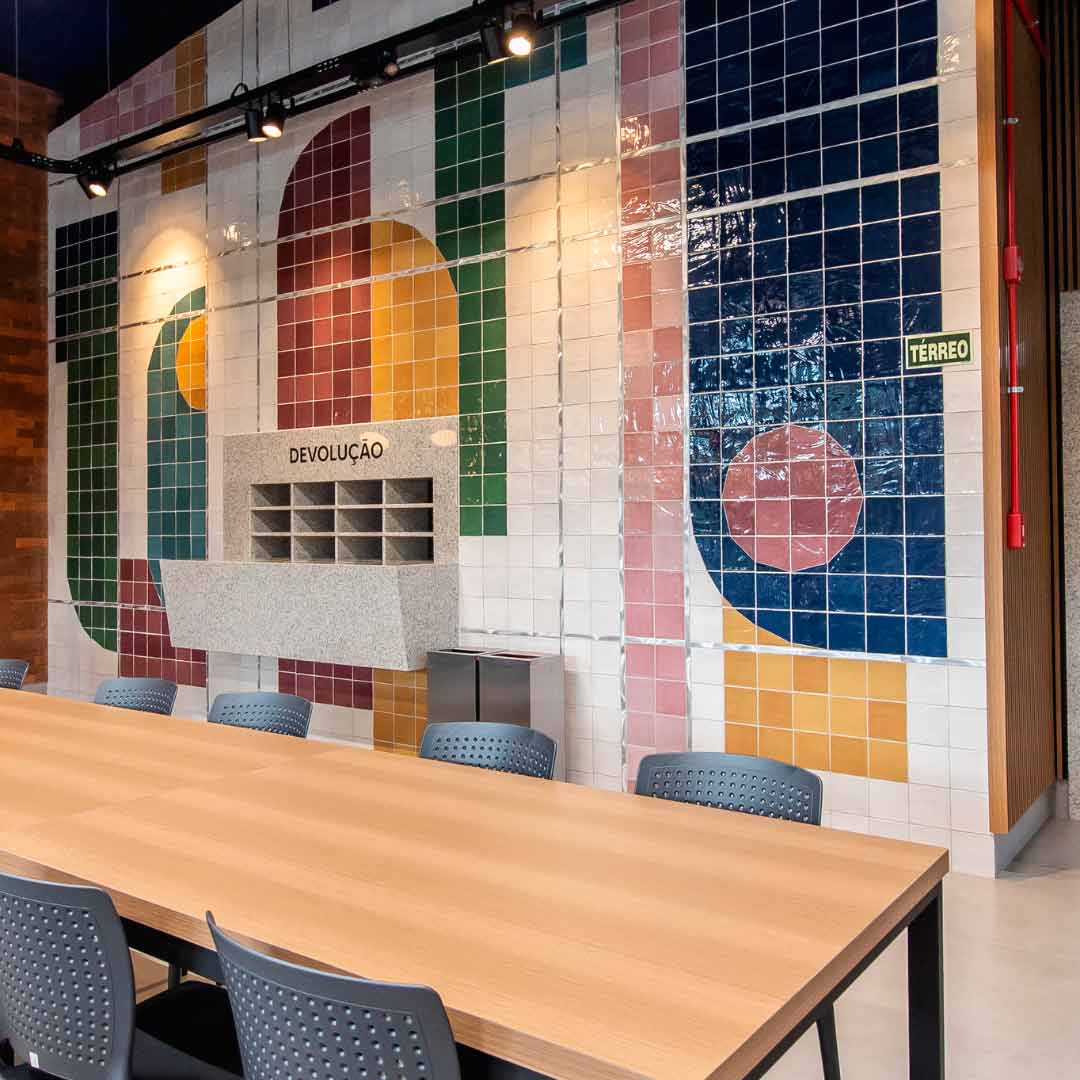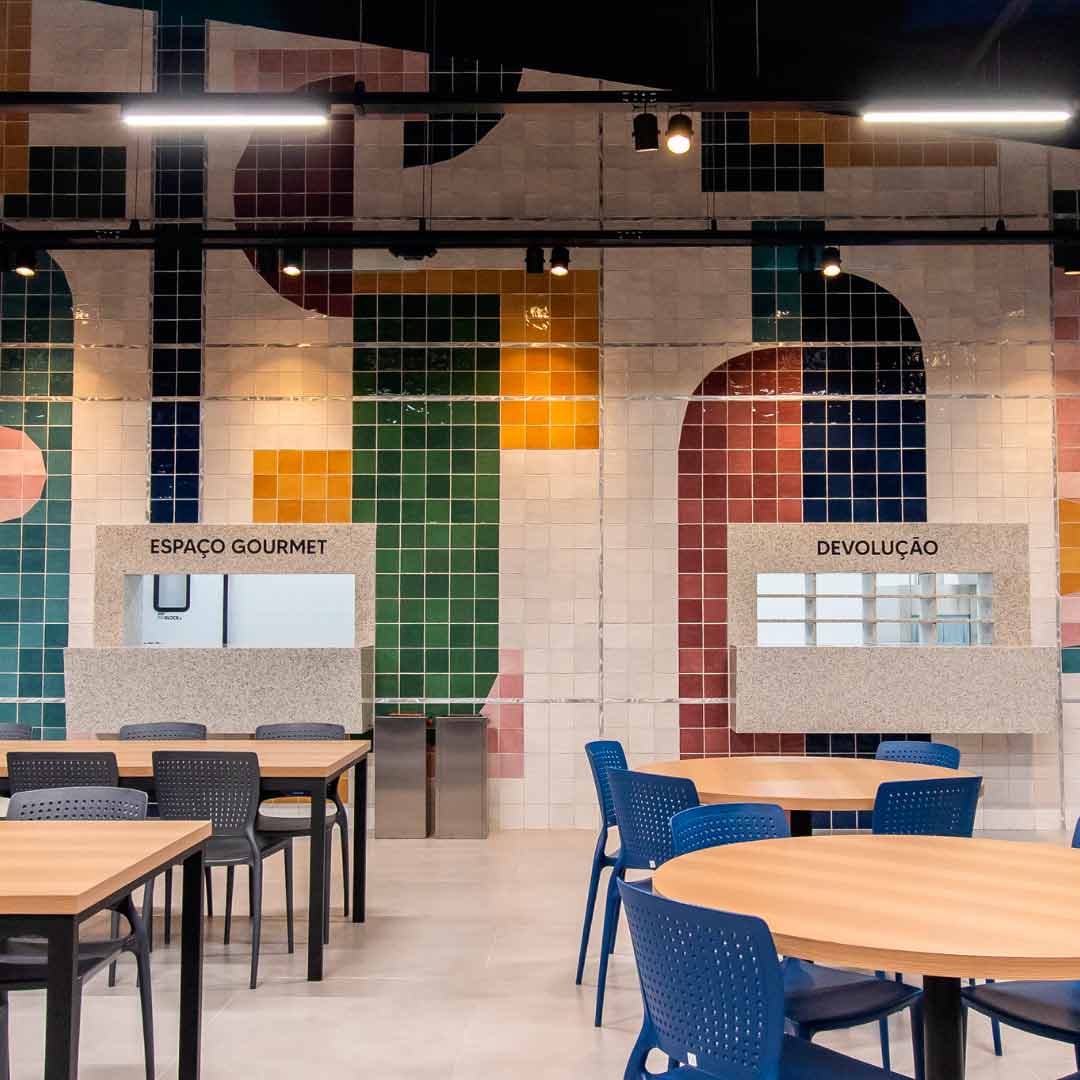 The design is inspired by the integration of nature within the space. Large windows allow the exterior greenery to "enter" the cantina, enhancing the connection with the natural surroundings while also promoting the well-being of those enjoying their meals. The colorful background walls form a mosaic designed exclusively for this project, adding visual dynamism and creating a relaxing atmosphere. The blend of colors results in a design that encourages both energy and serenity.
