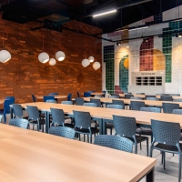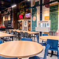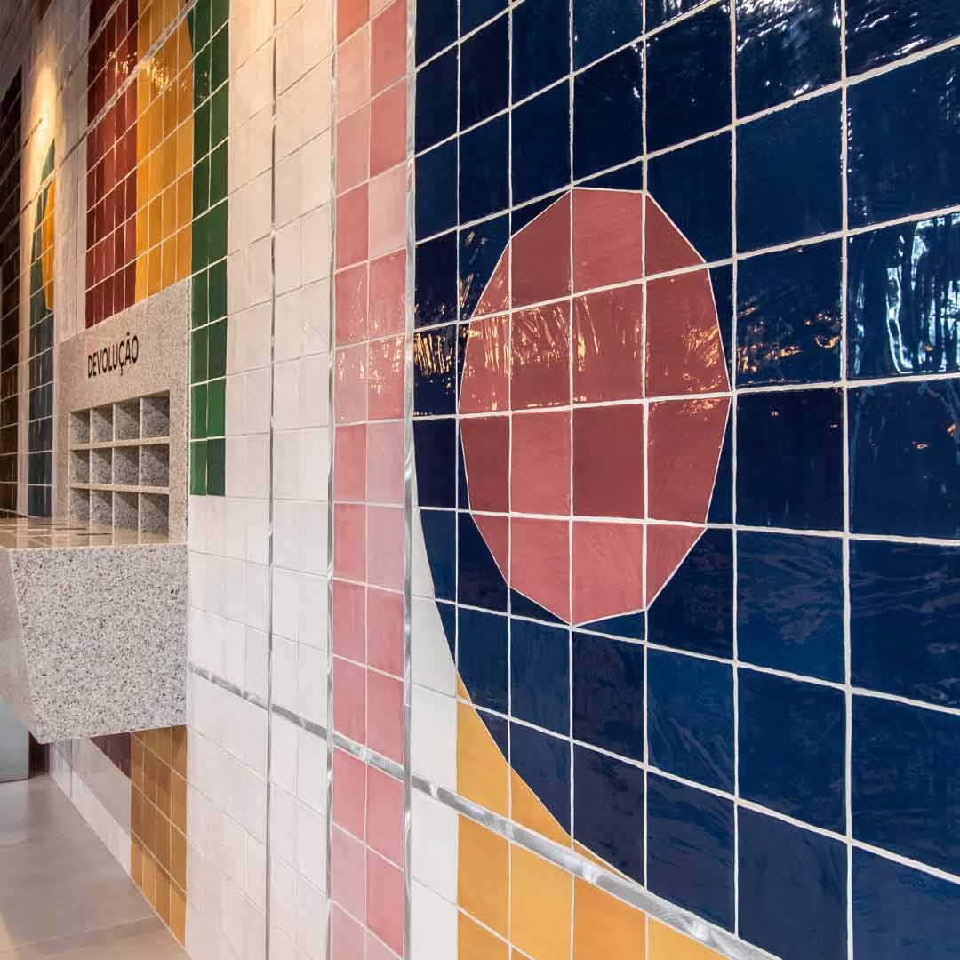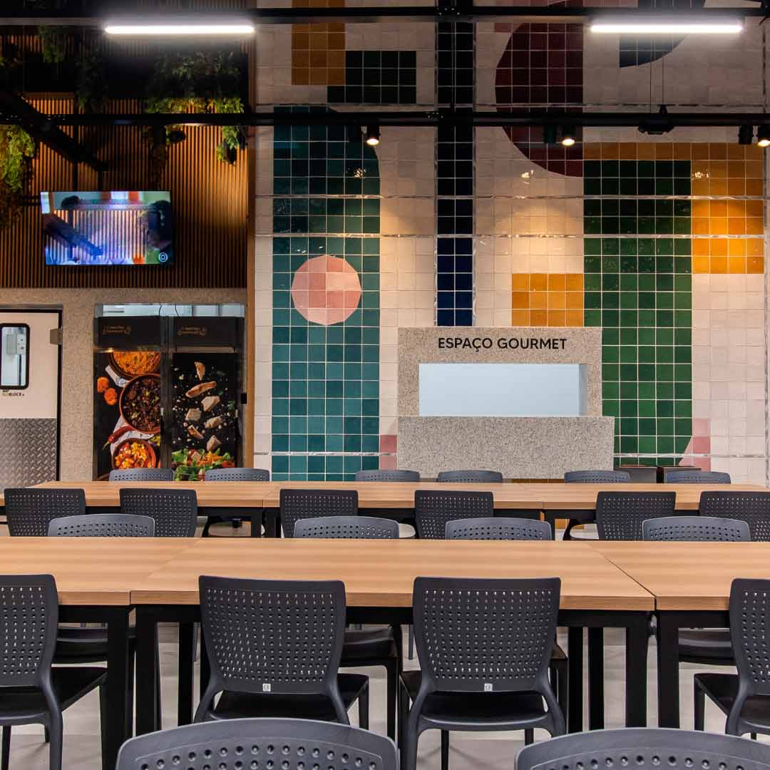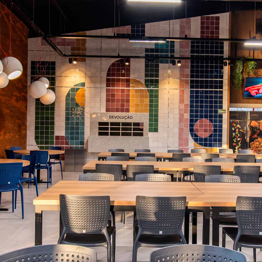 The design is inspired by the integration of nature within the space. Large windows allow the exterior greenery to "enter" the cantina, enhancing the connection with the natural surroundings while also promoting the well-being of those enjoying their meals. The colorful background walls form a mosaic designed exclusively for this project, adding visual dynamism and creating a relaxing atmosphere. The blend of colors results in a design that encourages both energy and serenity.