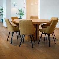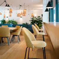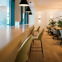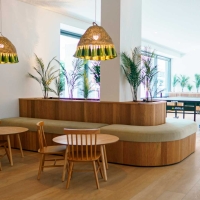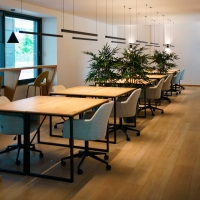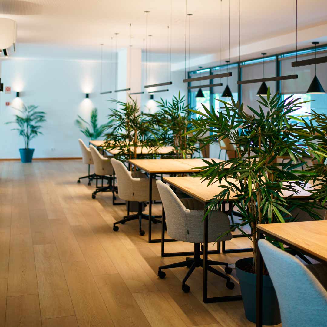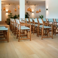In the coworking areas, the Honey Oak flooring creates a serene and professional atmosphere. The combination of shared work tables, indoor plants, and natural light fosters creativity and productivity. The floor’s tone subtly integrates with natural materials and soft furnishings, contributing to a quiet yet lively space. Meanwhile, the multipurpose room—equipped with light wood folding chairs and artisanal pendant lamps—easily becomes a setting for meetings, workshops, or private events. Here, the flooring acts as an elegant, functional backdrop, capable of handling constant traffic and furniture rearrangements without losing its beauty or integrity.