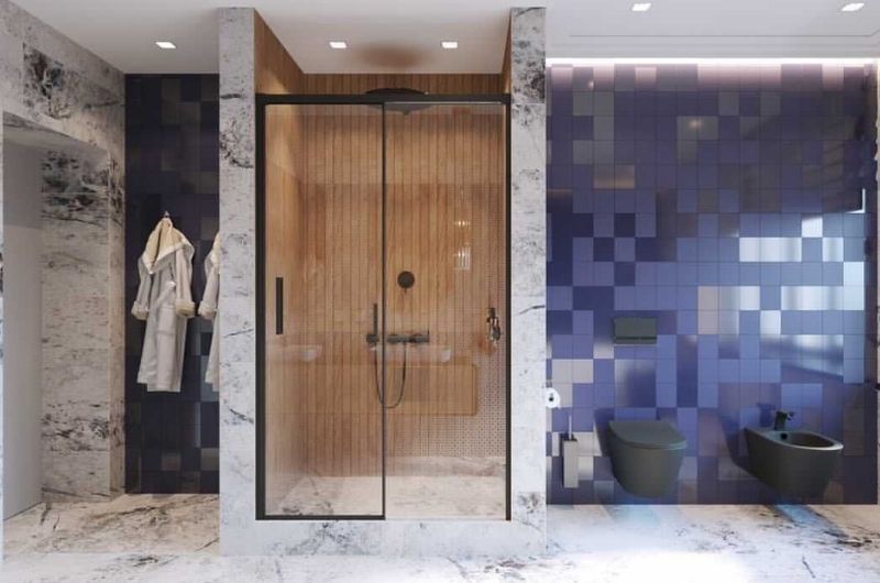 Similarly, to cover the area around the bathtub and mark out the shower area, it was decided to randomly combine Forma Polar tiles with gloss and matt finishes. It is worth noting that these two ranges have a PVD finish, highlighting the subtle differences between the pieces and creating appealing plays of light and shadow. By making this choice, Sofronova has managed to recreate the effect of the waves crashing on the sea, where you can see different shades of blue.