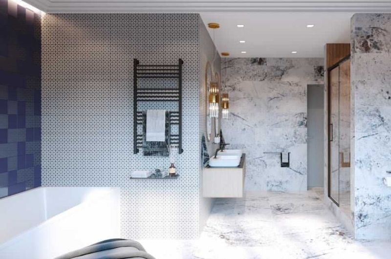 So, based on the expressed requirements, Maria Sofronova chose the Baikal Blue range to create the sea environment. This tile, with a marble-effect finish, is streaked with copper-colored veins that blend in perfectly with the blue hues. The designer used it for the flooring and for the tiling on some parts of the walls, thus creating a seamless effect.