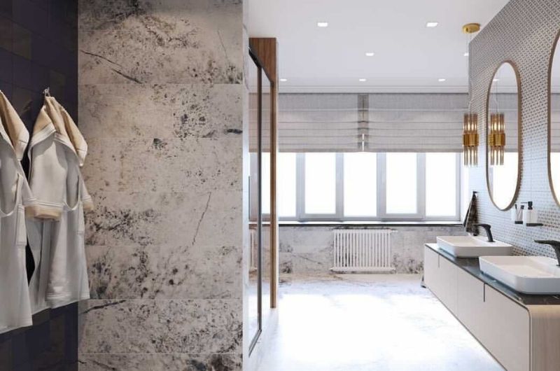 To round off the room, the interior designer has combined black and white bathroom fixtures, giving the room a neutral combination and highlighting the aesthetic qualities of the tiles. The furniture, wooden and in a nude color, stands out for its shape and originality. 10 out of 10 for this bathroom!