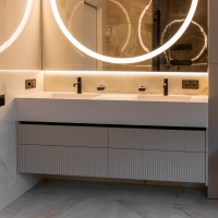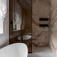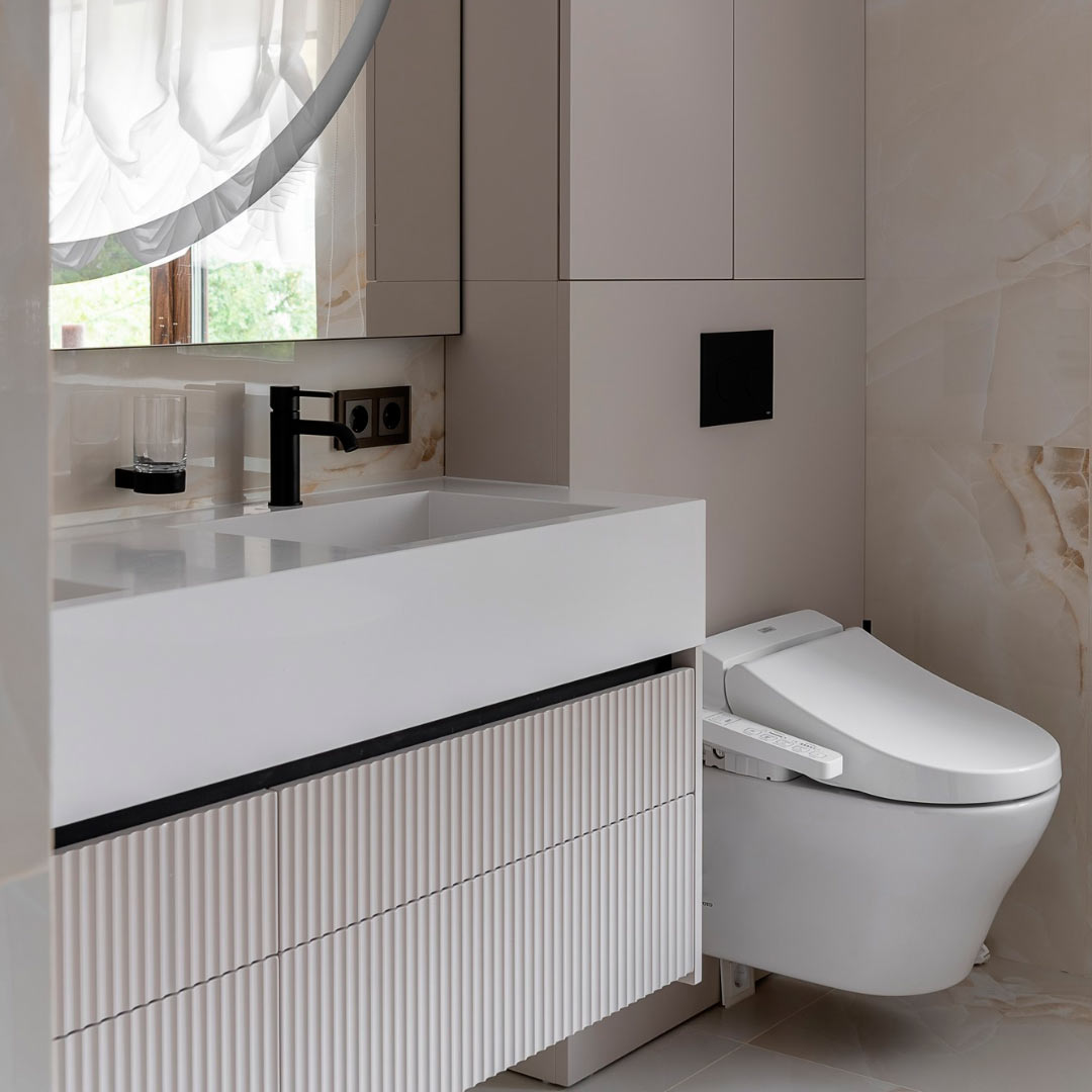 This bathroom renovation project, carried out by Marina Sviridonova, was conceived to transform a traditional space into a contemporary environment that blends luxury and warmth, designed to provide functionality and comfort for a whole family in Vladivostok.