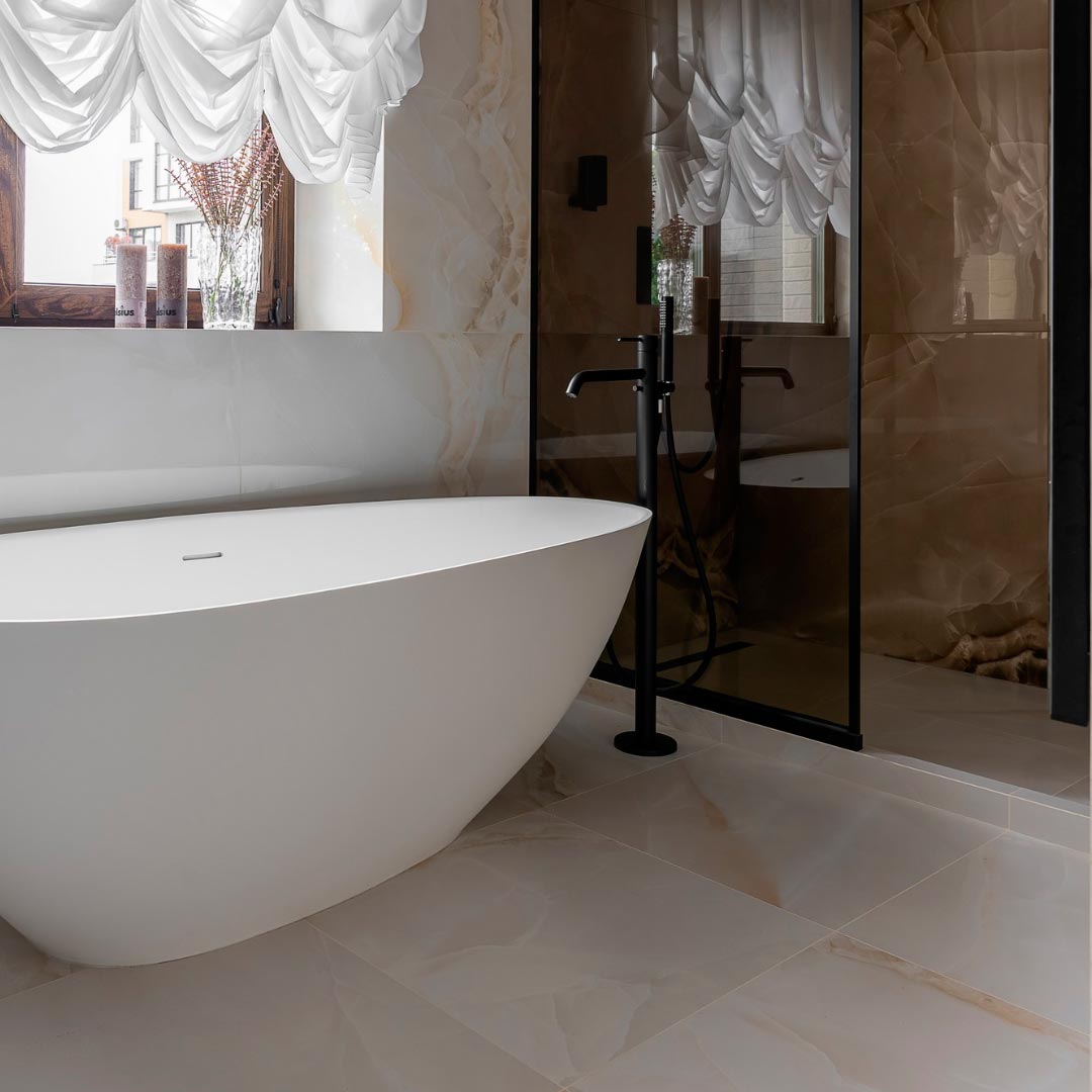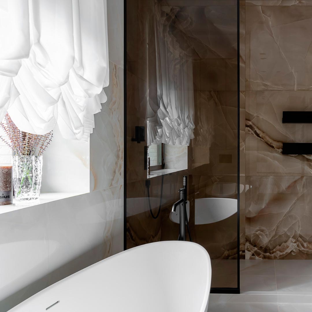 The central element of the design is our Selene porcelain tile, chosen for its soft cappuccino and beige tones that bring a natural and cozy elegance. These tones create continuous visual harmony, subtly dressing both floors and walls. The onyx-like veining of the porcelain adds an organic pattern that enhances depth and sophistication throughout the space.