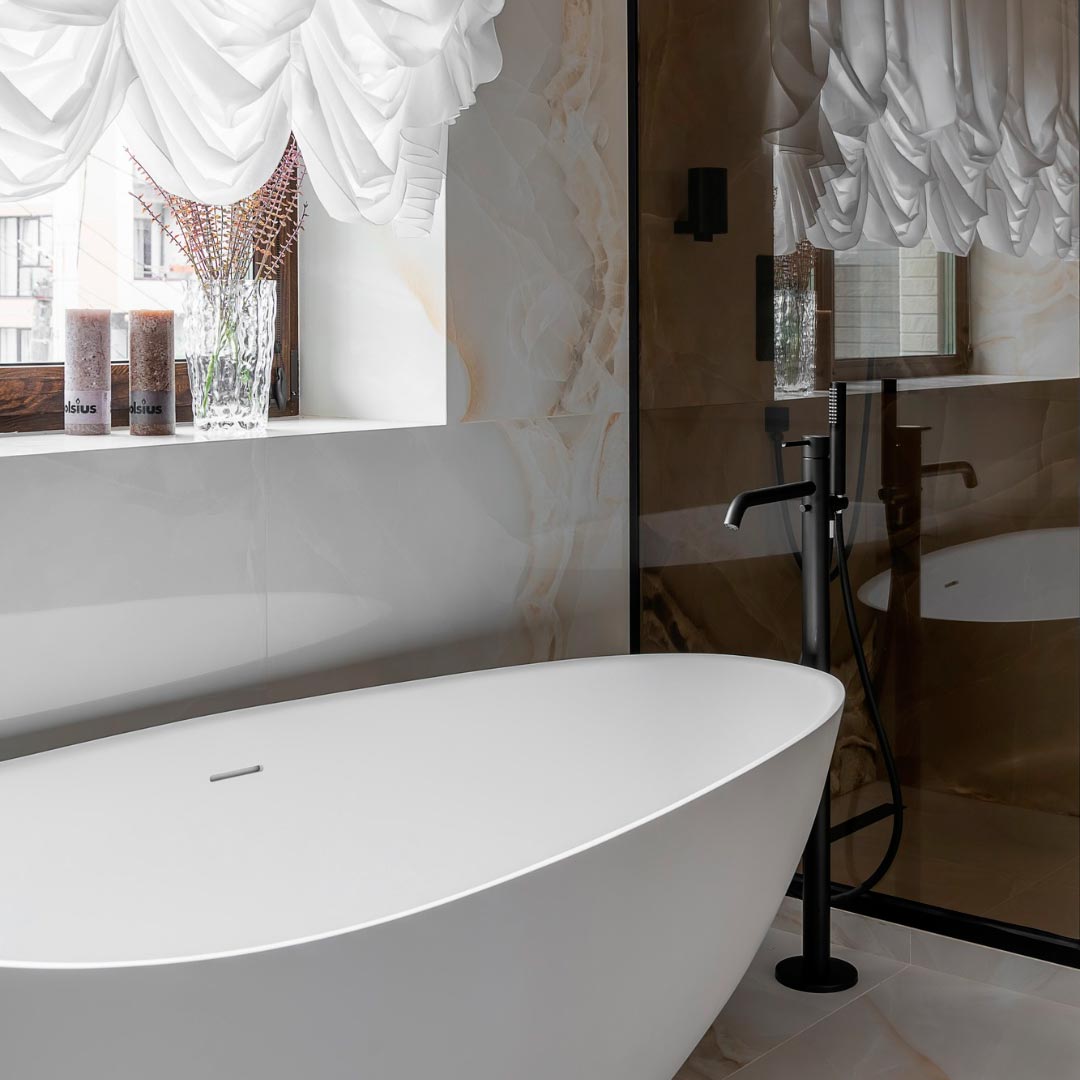 Finally, natural light filters through sheer white curtains, creating a serene and enveloping atmosphere that enhances the feeling of well-being throughout the bathroom. The result is an elegant, warm, and sophisticated space—ideal for moments of peace and comfort.