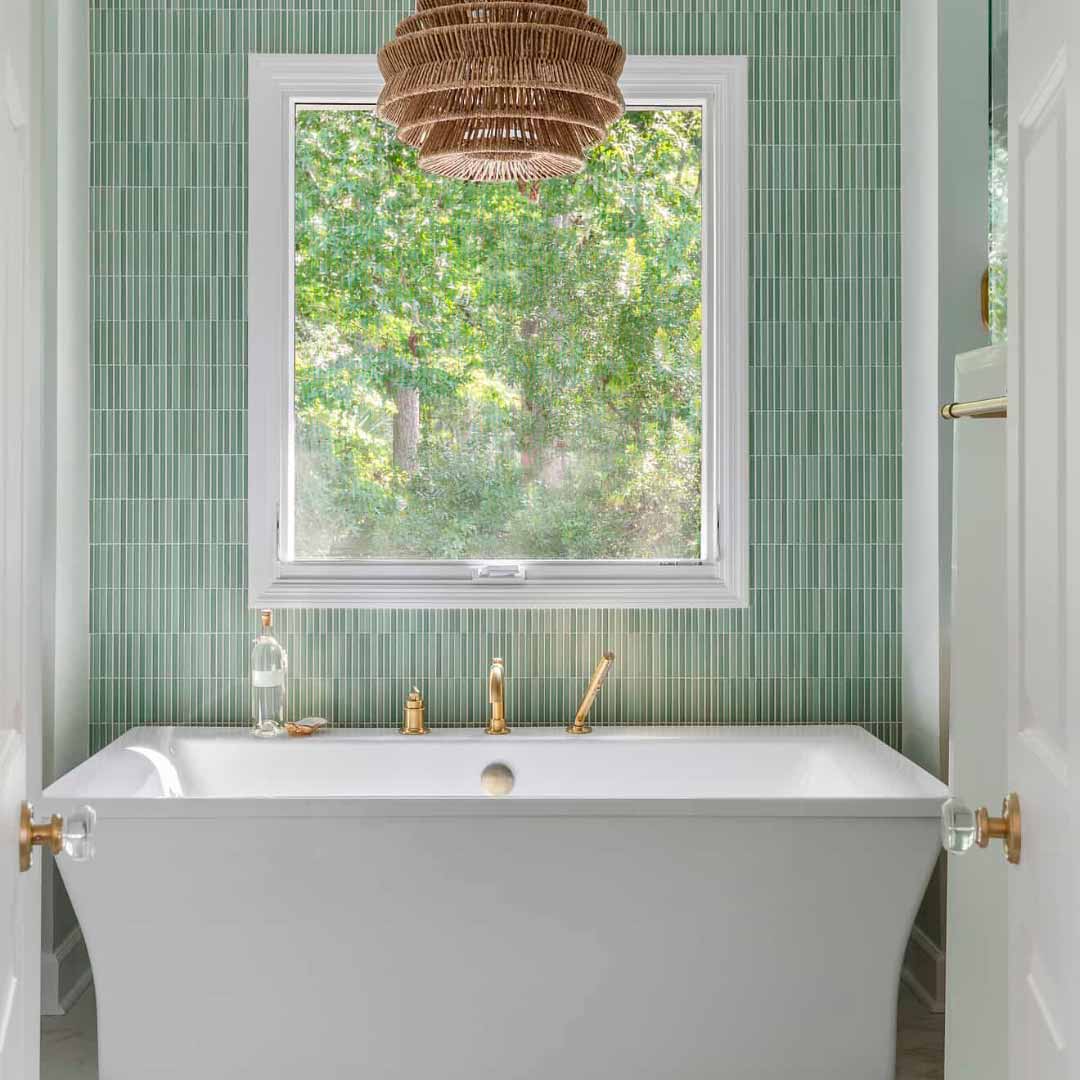 In the renovation of the main bathroom at Dunes West, interior designer Emily Watson has created a space where visual serenity and a connection with nature take center stage. The Kit-Kat Anise Green Matt wall covering brings a delicate texture and a soft green hue that surrounds the freestanding bathtub, creating an intimate and relaxing atmosphere. Its elongated format and vertical composition visually slim the wall, generating a height-enhancing effect that amplifies the natural light entering through the large front window.