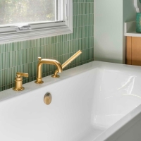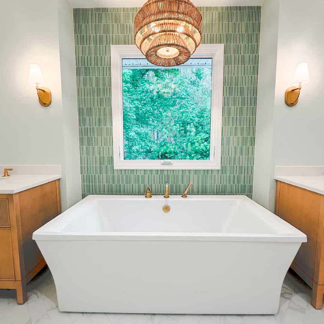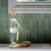 In this main bathroom renovation project, visual serenity and a connection with nature take center stage. The Kit-Kat Mosaic Anise Green Matt wall covering adds a delicate texture and a soft green hue that surrounds the bathtub, creating an intimate and relaxing space.