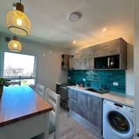 To achieve this, a smart space planning was implemented, with a linear layout that optimizes the available space. All essential elements are placed along a single wall: stove, sink, dishwasher, washing machine, built-in microwave, and a vertical wall-mounted boiler. Opposite this, there's a wooden table with high chairs, perfect for informal meals or as an additional workspace.