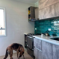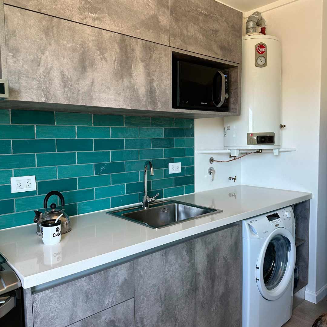 Despite its small size, this kitchen conveys a sense of spaciousness, order, and character. The mix of textures—from the cement furniture to the glazed tiles—adds visual richness without being excessive. The turquoise green of the backsplash serves as the design's guiding thread, providing a vibrant splash of color that not only decorates but also inspires.
