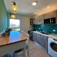 The true star of this kitchen is undoubtedly our Tabarca Turquesa ceramic tile, which covers the backsplash. With its 7,5x23 cm format and staggered horizontal placement, it adds visual dynamism to the wall without overwhelming it. Its intense and saturated turquoise hue evokes the crystal-clear waters of the Mediterranean, giving the space a unique personality that balances nostalgia and modernity. The color variation between tiles, a typical feature of handcrafted ceramics, creates a beautiful watercolor effect. Moreover, the Tabarca Turquesa acts as a visual connector between cooler elements (like stainless steel appliances and cement-gray furniture) and warmer ones, such as the natural wood countertop of the dining table and the wicker details of the pendant lamps.
