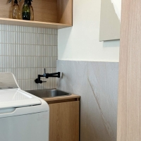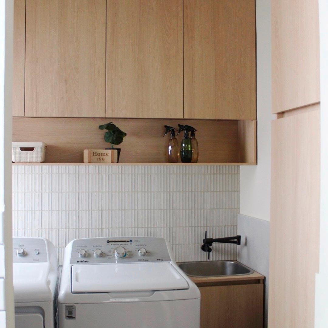 A complete remodeling project of a bathroom and laundry room where visual cleanliness, geometric shapes, and functionality are strongly emphasized.