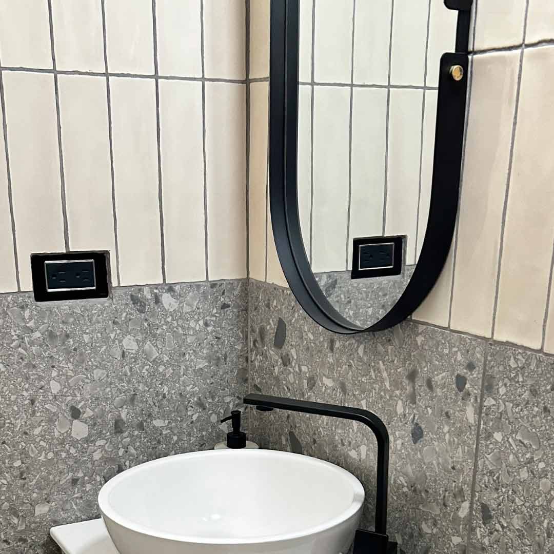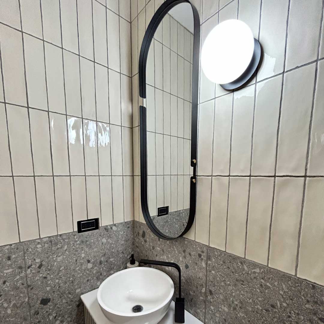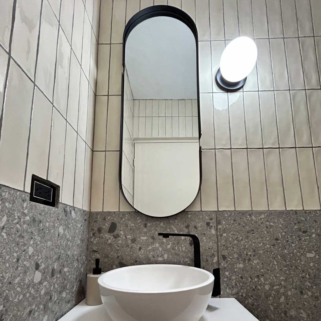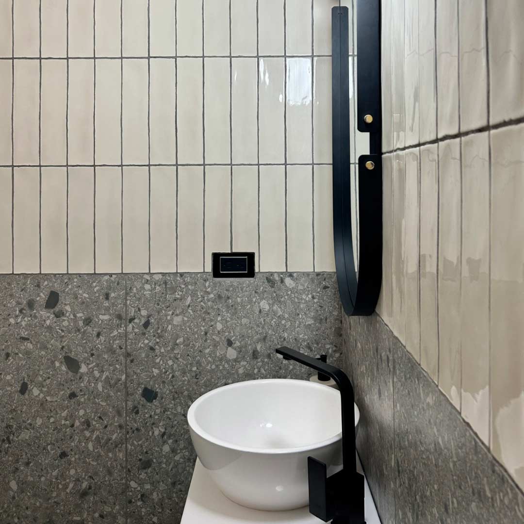 For the bathroom remodel, the Mexican influencer has chosen our Atelier White Glossy series, a piece that mimics handmade ceramics, characterized by its irregular edge and slight relief. The choice of glossy white tiles with dark grout to match the rest of the bathroom elements (mirror, towel rack, faucet) is a very suitable choice to create a timeless, modern ensemble with a certain urban rustic touch. A perfect balance between the traditional (tiles that imitate handmade pieces and a renewed terrazzo) along with more design-oriented decorative elements that update the spaces.