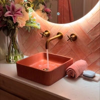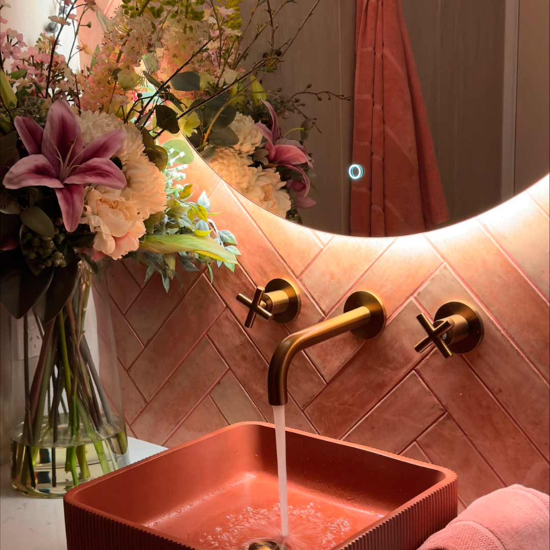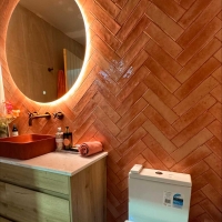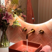 The backlit mirror with warm light enhances the texture of the tile and its pink hues, bringing a sense of wellbeing that invites relaxation. The combination of materials and tones creates a stylish and serene atmosphere, ideal for an intimate space with personality. We love the result: a bathroom that stands out for its elegant and feminine style, which achieves a perfect balance between style and warmth, and creates a unique and refined atmosphere.
