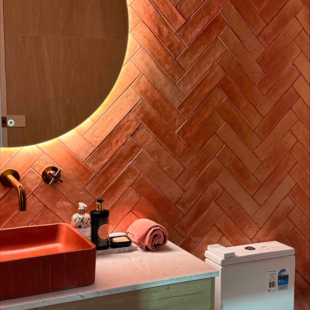 Installed in a herringbone pattern, our Agadir Amaranto porcelain tile adds dynamism and a handcrafted look that contrasts and balances perfectly with the other elements of the bathroom: natural wood, brushed bronze finish taps and carefully selected decorative details. This composition achieves a sophisticated and welcoming visual harmony.