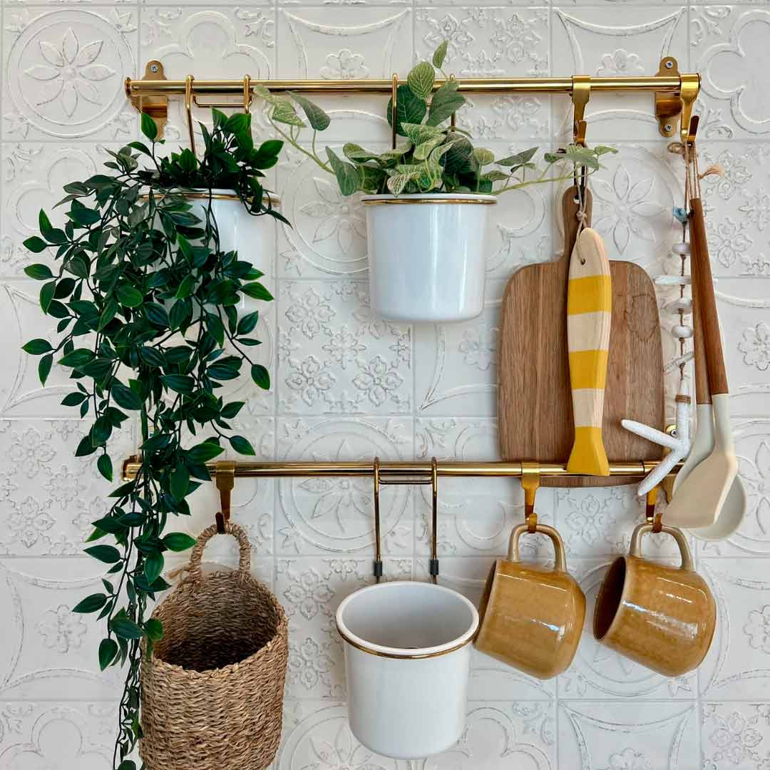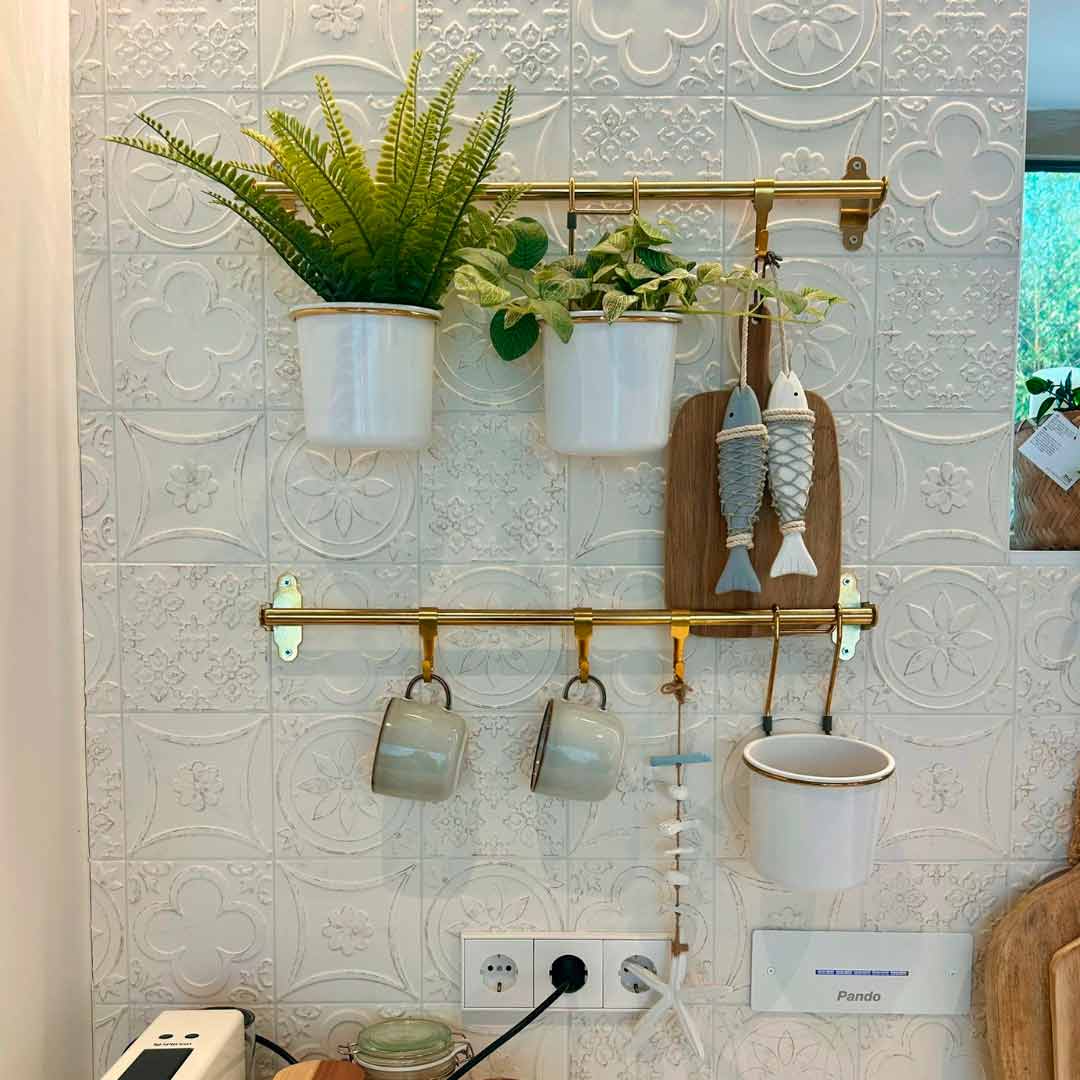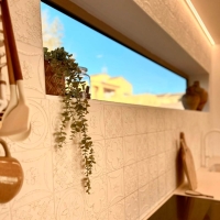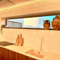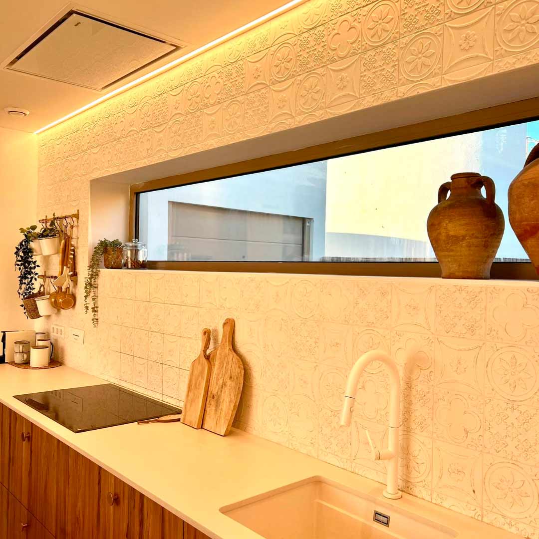 Our cladding stands out for its gypsum tone, contributing to brightness and spaciousness in the kitchen's backsplash. Along with the warm yellow light used and the window allowing natural illumination, it reinforces that feeling of home.