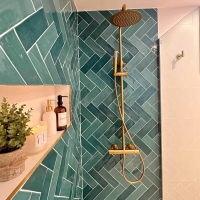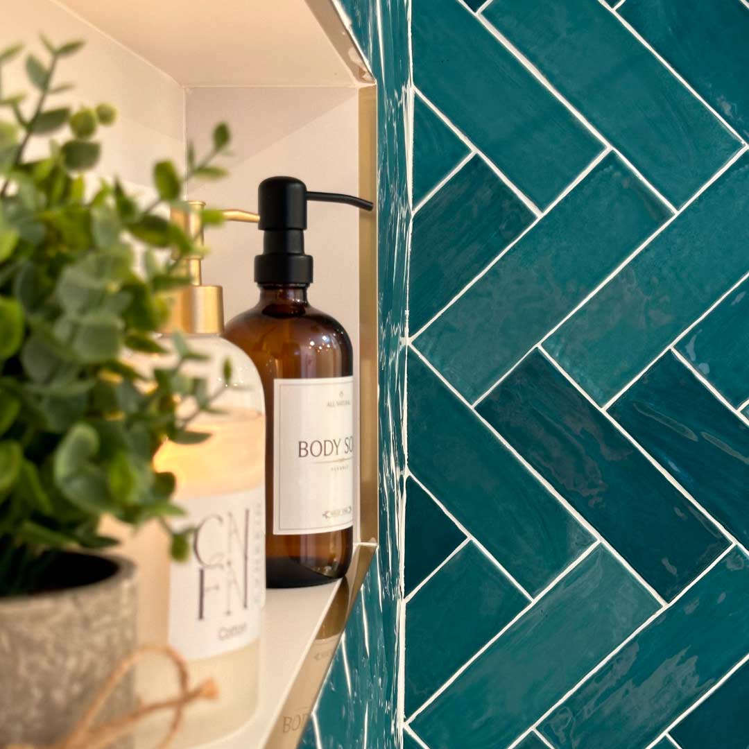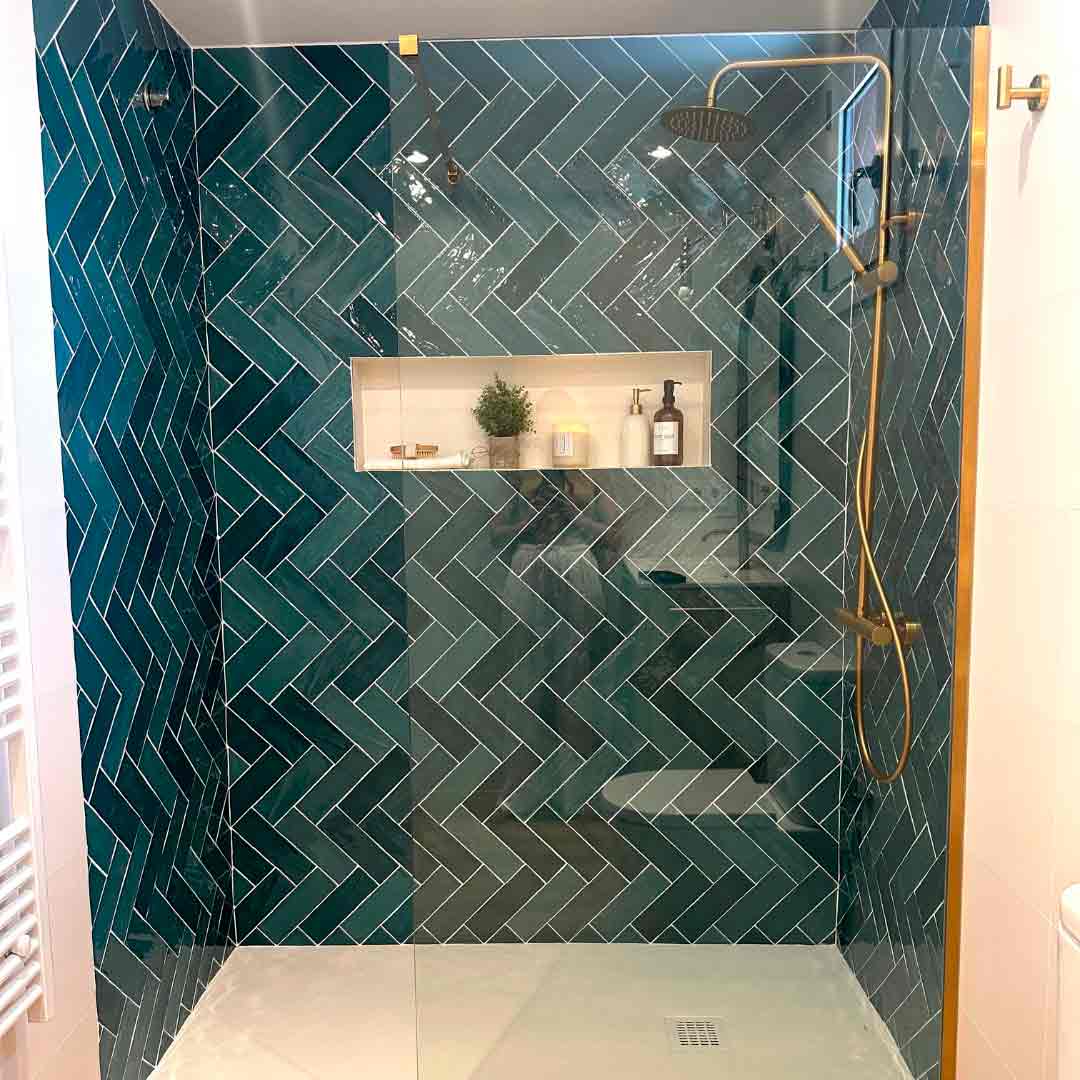 And this is where our colourful and vibrant Tabarca Turquoise piece comes into play, which placed in a herringbone pattern, exalts the wet area of the shower and gives it that touch of colour and dynamism that the rest of the bathroom lacks. The versatility of the small piece to be placed following this pattern and the vivid colour of our tile, bring energy and generate that striking and outstanding effect that Sparkling Reformes, the designers of the whole space, were looking for.