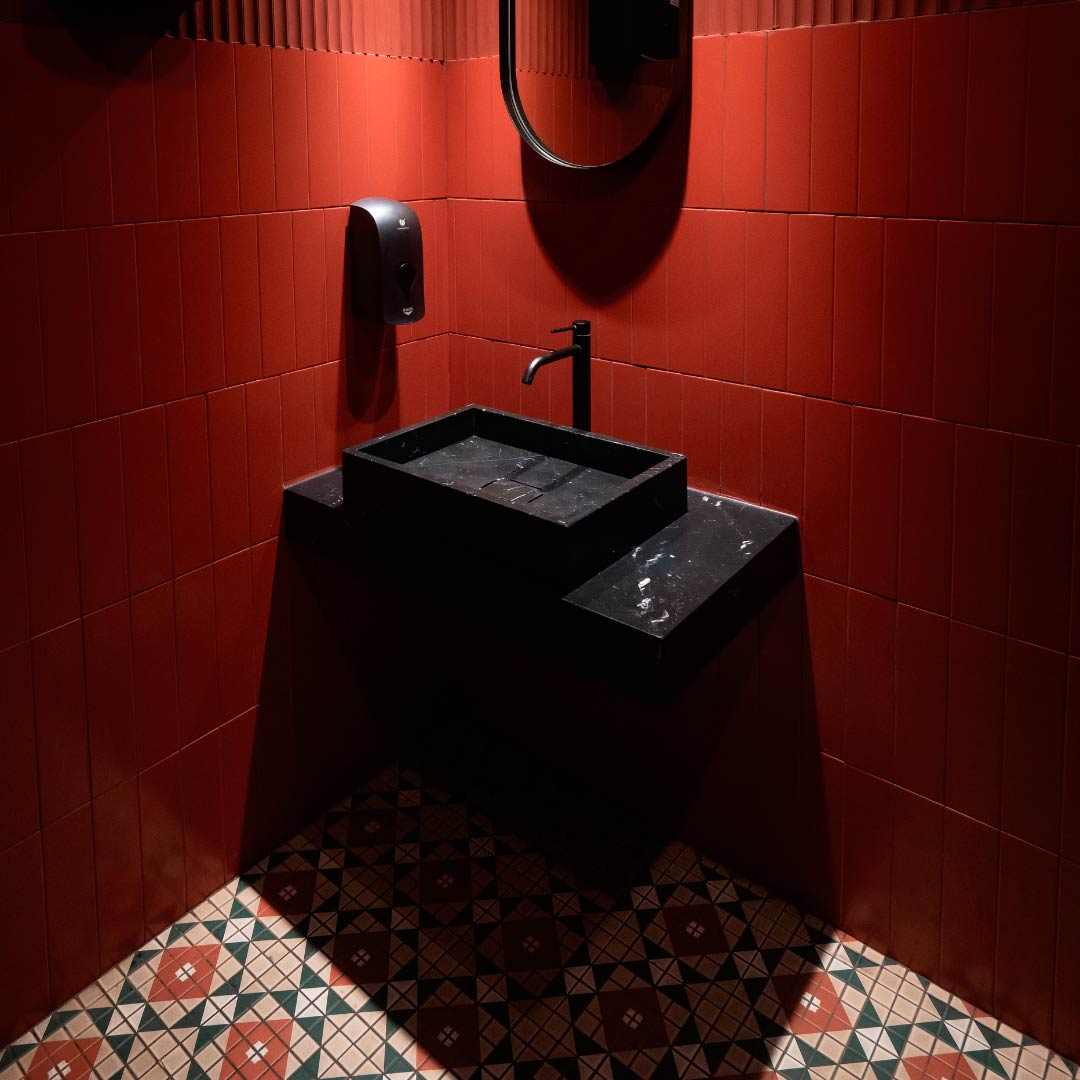 As mentioned above, our Flat Garnet Matt, a material with a matt finish that stands out for its subtle elegance and resistance, has been chosen for the cladding. It complements the modern design, adding a touch of sophistication that fits in perfectly with the vision of the space. The restaurant's bathroom perfectly showcases this modern, dark aesthetic, which catches the eye at first glance.