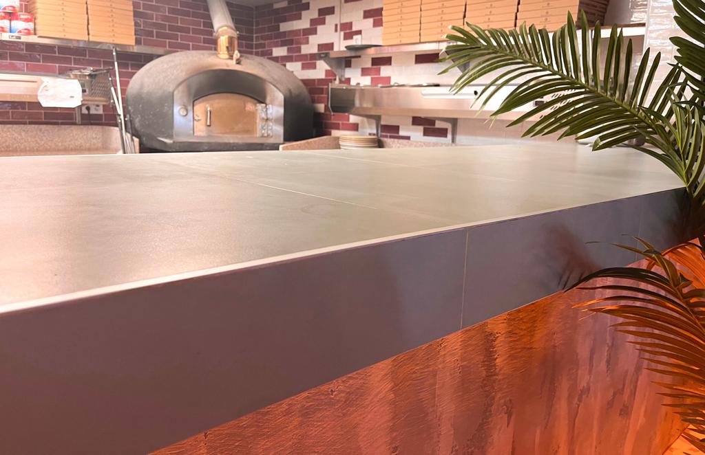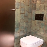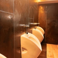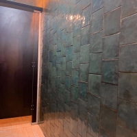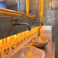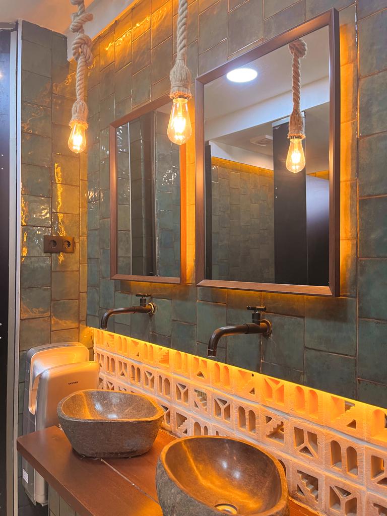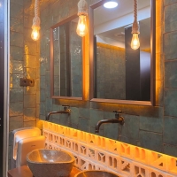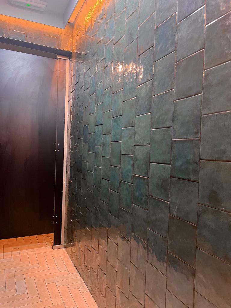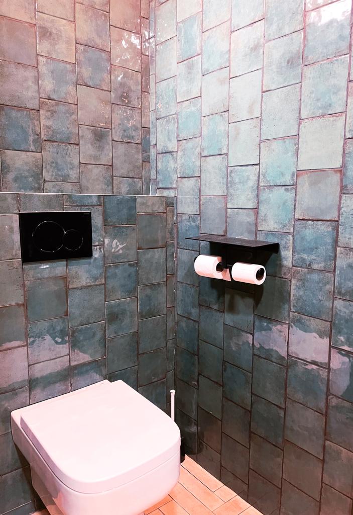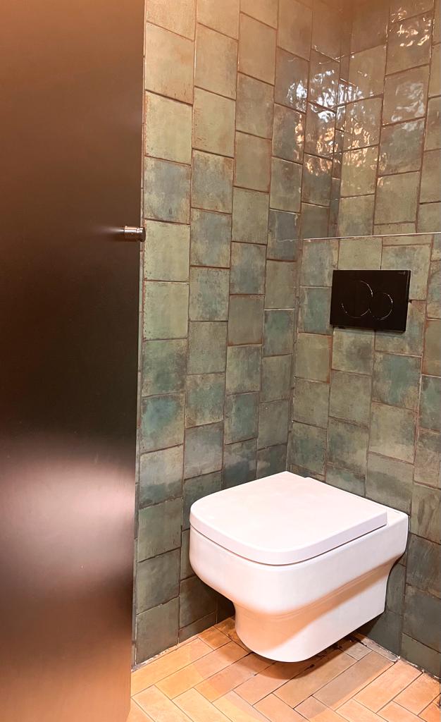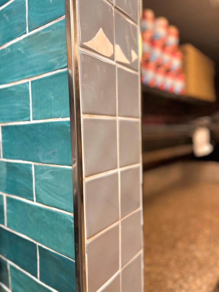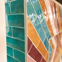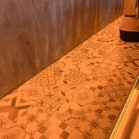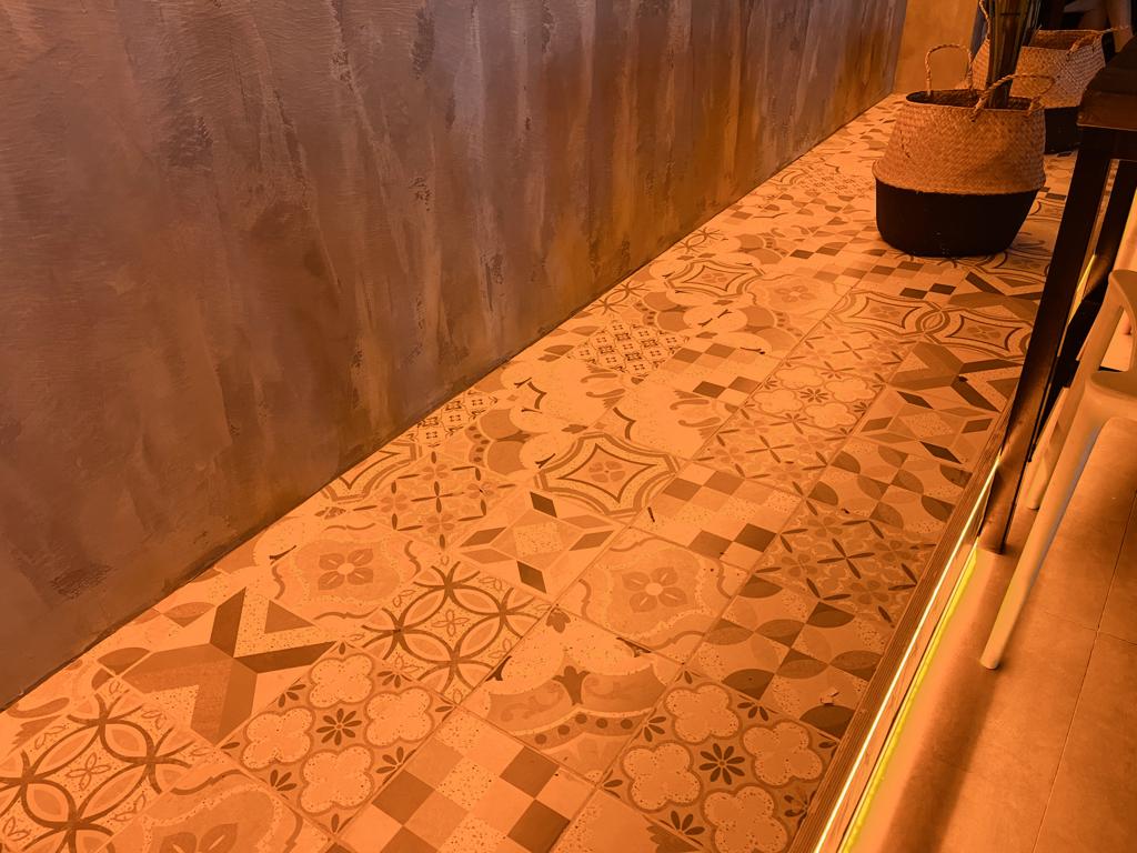 In the living room, Stella Coral and Stella Mar tiles have a strategic position, and thanks to the set of lights, they create the pizza zone beauty. In this part of the restaurant, they have also used the Berlin Aquamar tiles to coat the bar. To complete this Italian kitchen space, Tabarca tiles in garnet and white colours cover the pizza oven-zone walls. In the drinks area, the bar features Stripes Mix Teak tiles on the walls. This tile imitates the texture of wood and enhances the rustic-style decoration of the entire restaurant. To complete, in the bathrooms of the nightlife area, the Diurne Oxide series is perfect. Its imitation rust effect is ideal for creating a different space. Congratulations to the whole team at La Torreta 1888 for the result!