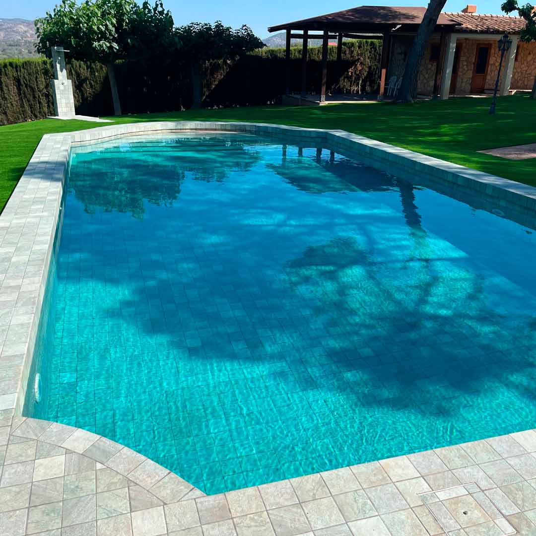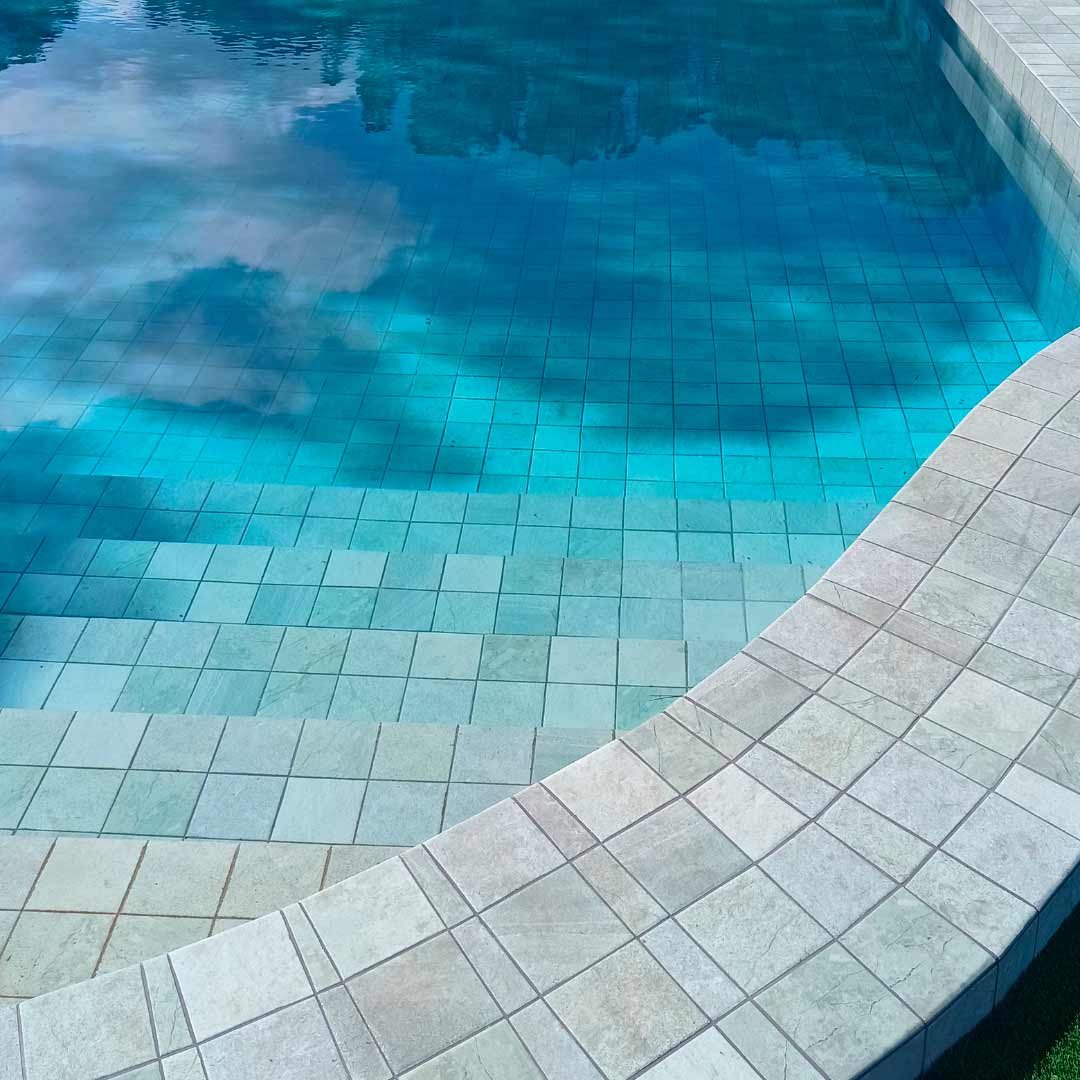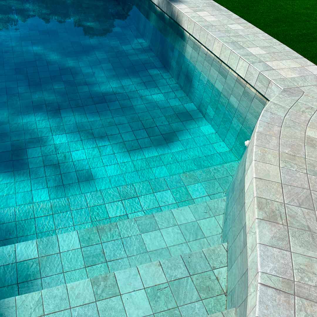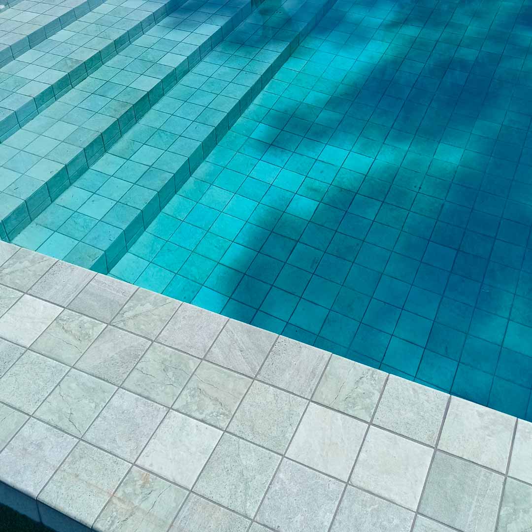 The interior of the pool, which gives visual continuity to the project, reflects the sunlight impeccably, creating a play of shadows and sparkles that gives the sensation of being in front of a mirror of crystal clear water. This type of tiling helps to enhance the natural colour of the water, giving it a clean, fresh and relaxing appearance.