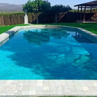 This private pool stands out for its rectangular design with gently rounded corners, offering a modern look without losing the classic touch of traditional pools. Its location, in a natural setting, provides a sense of tranquillity and connection with nature. The inclusion of a small curve at the corners breaks the linearity, adding a subtle touch of dynamism to the design. This small detail not only enhances the aesthetics, but can also serve a practical function by smoothing traffic around the pool and facilitating access to certain points.