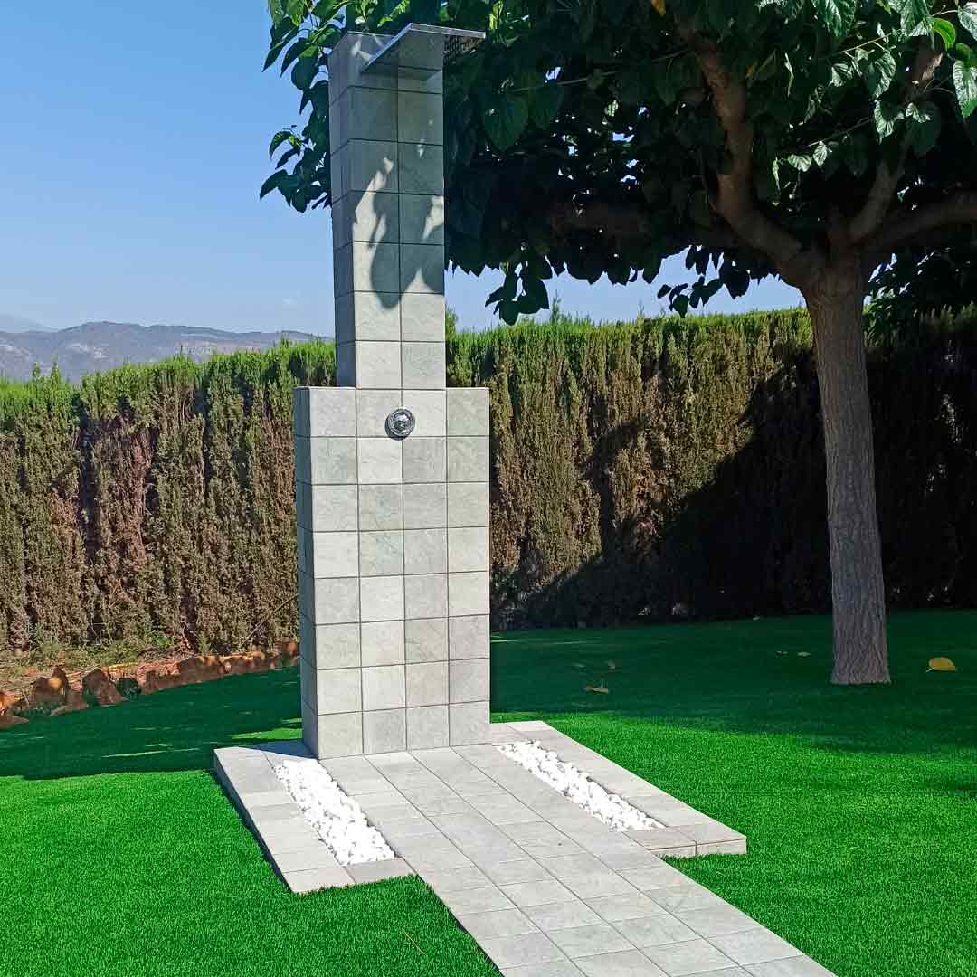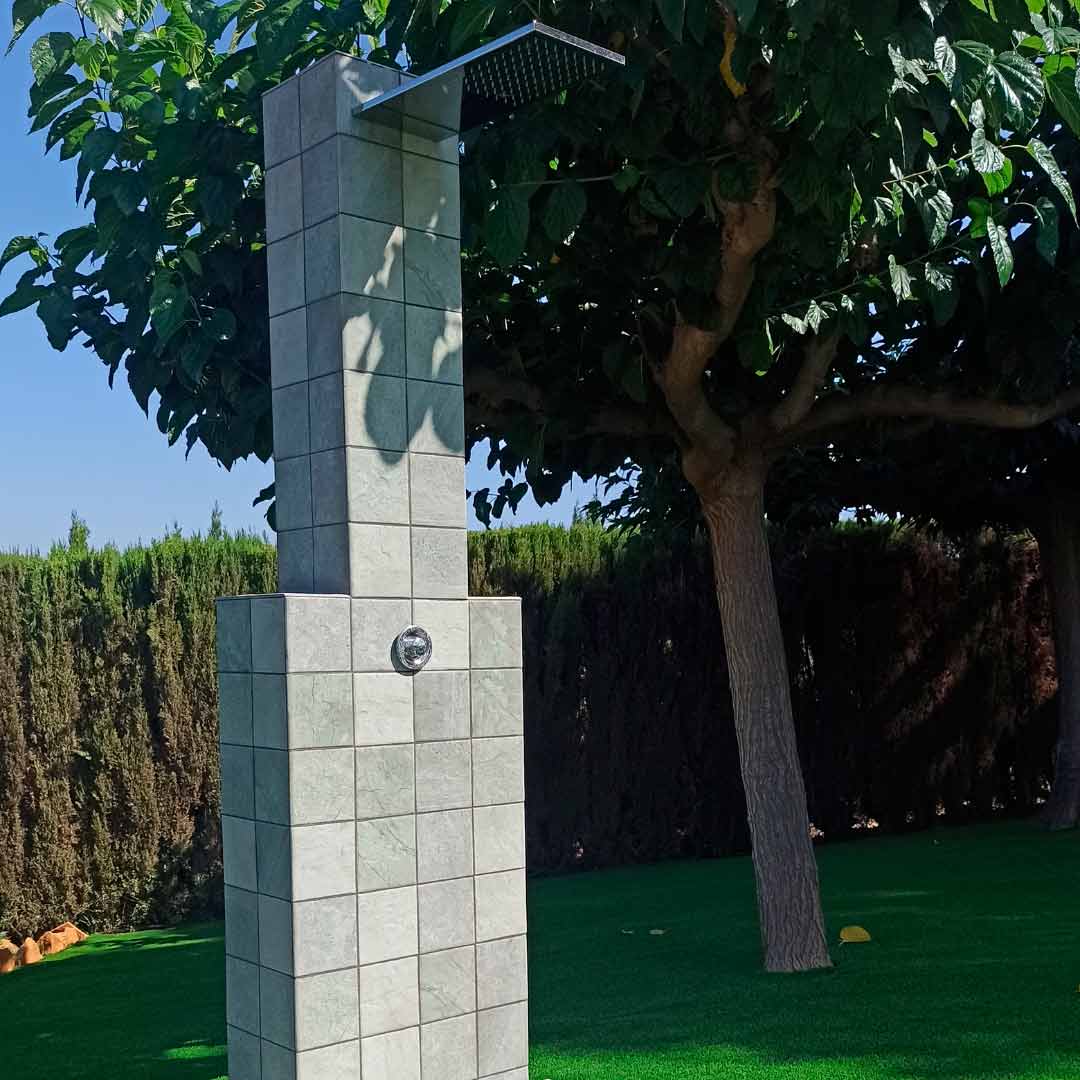 In addition, the outdoor shower perfectly complements the functionality of the pool. This shower has a design that follows the same aesthetic line as the pool, with the same tiles in its structure. It is placed on an elongated base that connects directly to the artificial grass.