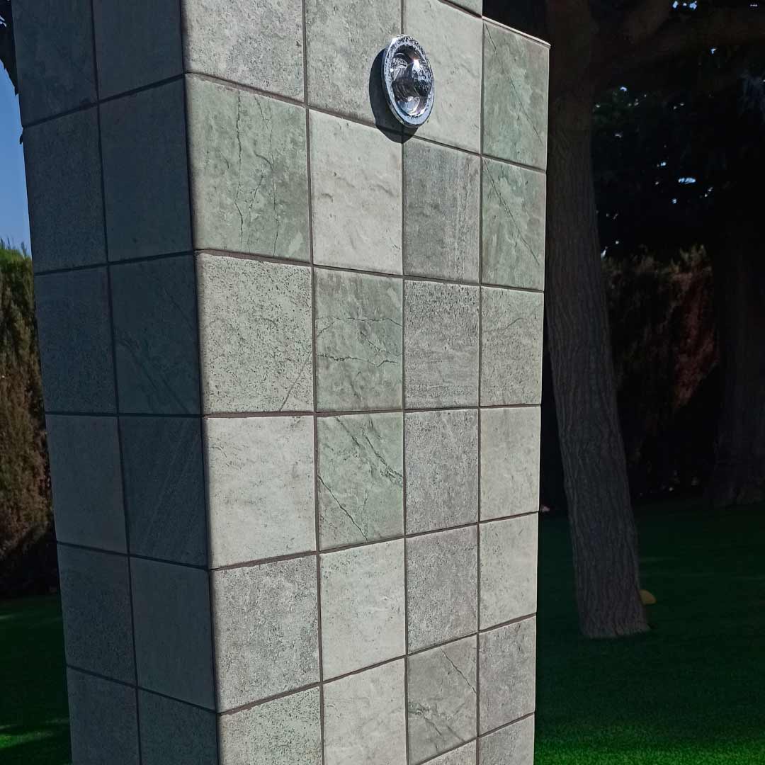 We highlight the use of our Bali porcelain tiles throughout the pool, both on the perimeter and inside. These tiles have a matt, non-slip finish, which is necessary for this type of use. Their greenish hue, inspired by the famous Bali stone or Sukabumi, not only complements their surroundings, but also reflects sunlight in a way that helps keep the water looking fresher and clearer. The interior of the pool creates a visual continuity that gives the feeling that the pool is an integral part of the landscape.