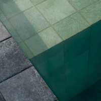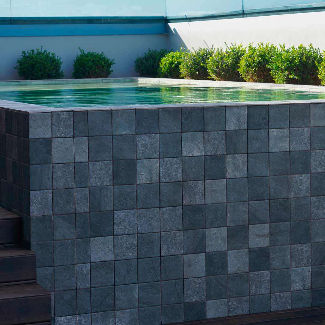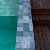 This porcelain tile is designed to emulate the chromatic richness and tonal variations of natural Balinese stone. Its blend of deep greens, turquoises, and subtle greyish hues produces a vibrant aquatic effect that changes with daylight and water depth. Under direct sunlight, the pieces reflect sparkling highlights, creating a visual effect reminiscent of exotic resort pools. In shallower areas, the tone becomes warmer and more crystalline, while in deeper sections it acquires a more intense appearance.