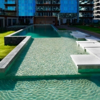 As one moves toward the central area, the pool becomes deeper and adopts a more solemn character. The tones intensify, and the water sheet reflects the surrounding architecture with almost mirror-like precision. The buildings bordering the complex, with their broad terraces and modular façades, find in the pool a reflective element that amplifies the sense of spaciousness and visual continuity. The combination of contemporary materials, water and tropical vegetation generates an urban resort atmosphere that elevates the residential experience. The project also stands out for its landscape integration. The gardens, laid out in clean lines and planted with large, sculptural species, accompany the length of the pool and reinforce the verticality of the ensemble.
