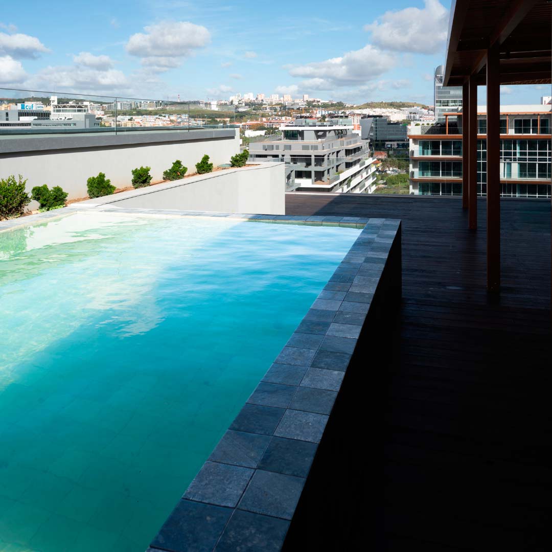In the heart of Miraflores, one of Lisbon’s most privileged residential enclaves, rises an urban complex that redefines the concept of contemporary well-being. This project, developed by NORFIN and designed and executed by Atelier Sidney Quintela, embraces a balanced dialogue between architecture, landscape and water. Its undisputed protagonist is a sculptural pool, conceived not only as a leisure area but as a true central piece of the entire residential ensemble.