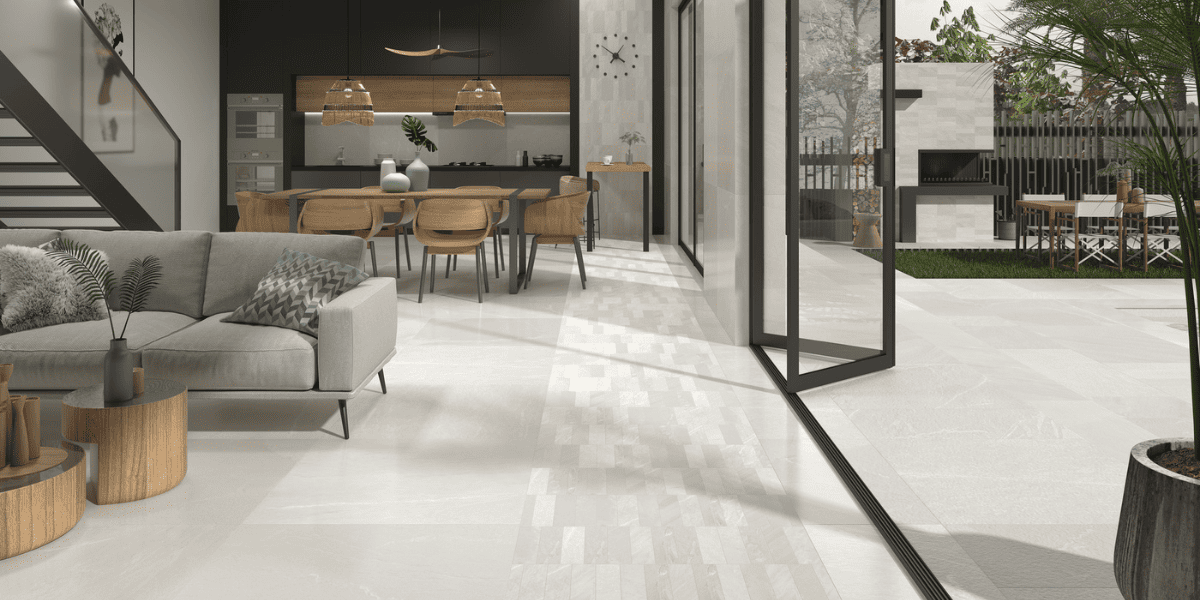 Utiliser le même matériau à l’intérieur et à l’extérieur est une manière très efficace d’agrandir visuellement les espaces. Cette approche est largement utilisée dans l’architecture contemporaine.
