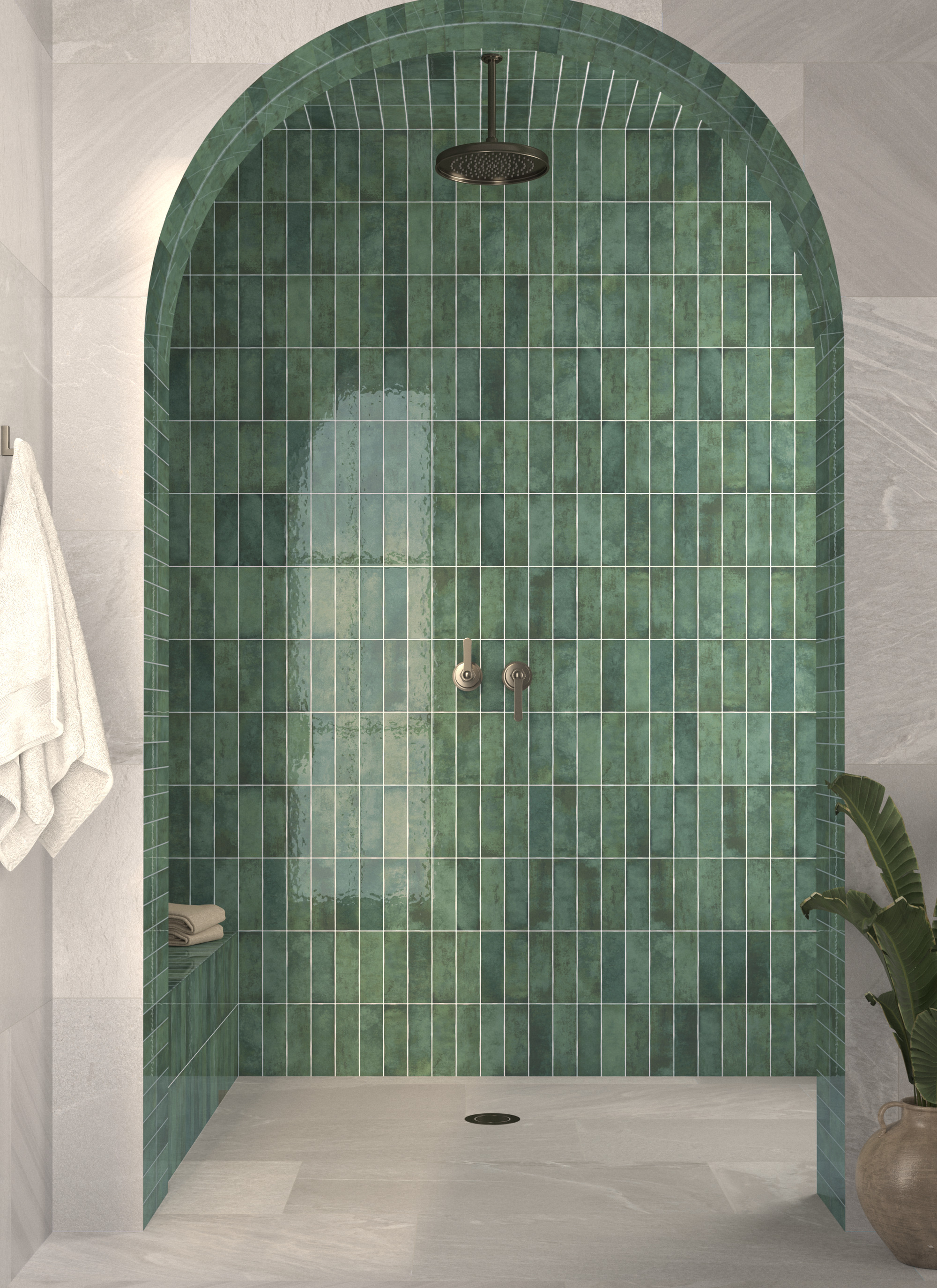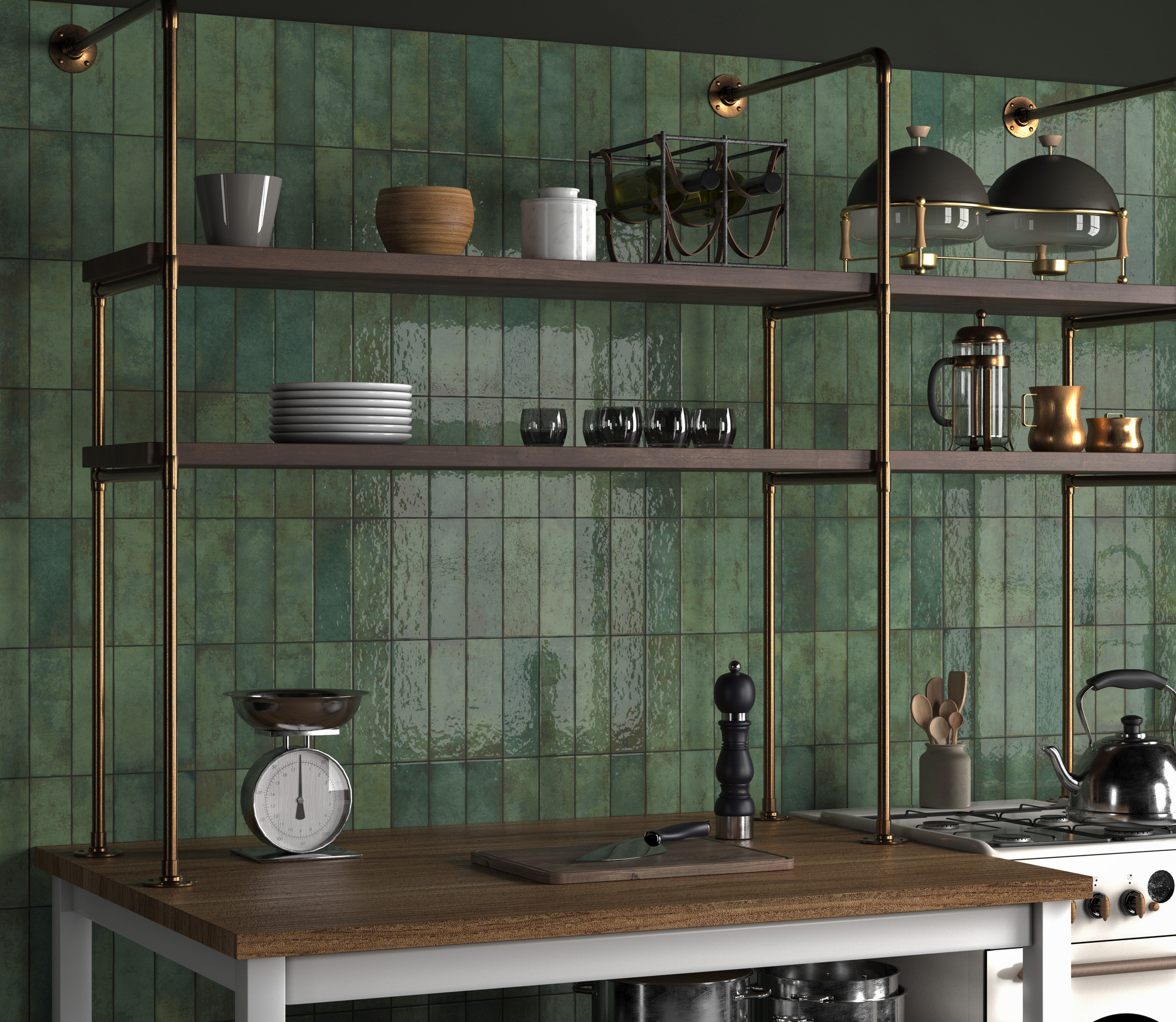 Carreau mural céramique petit format 6,5×20 cm, qui se distingue par sa profonde tonalité verte, son éclat vitré et son travail matérique abouti. Cette couleur se connecte à la nature et à l’artisanat, apportant sérénité, élégance et richesse chromatique aux espaces qui recherchent une identité céramique forte.