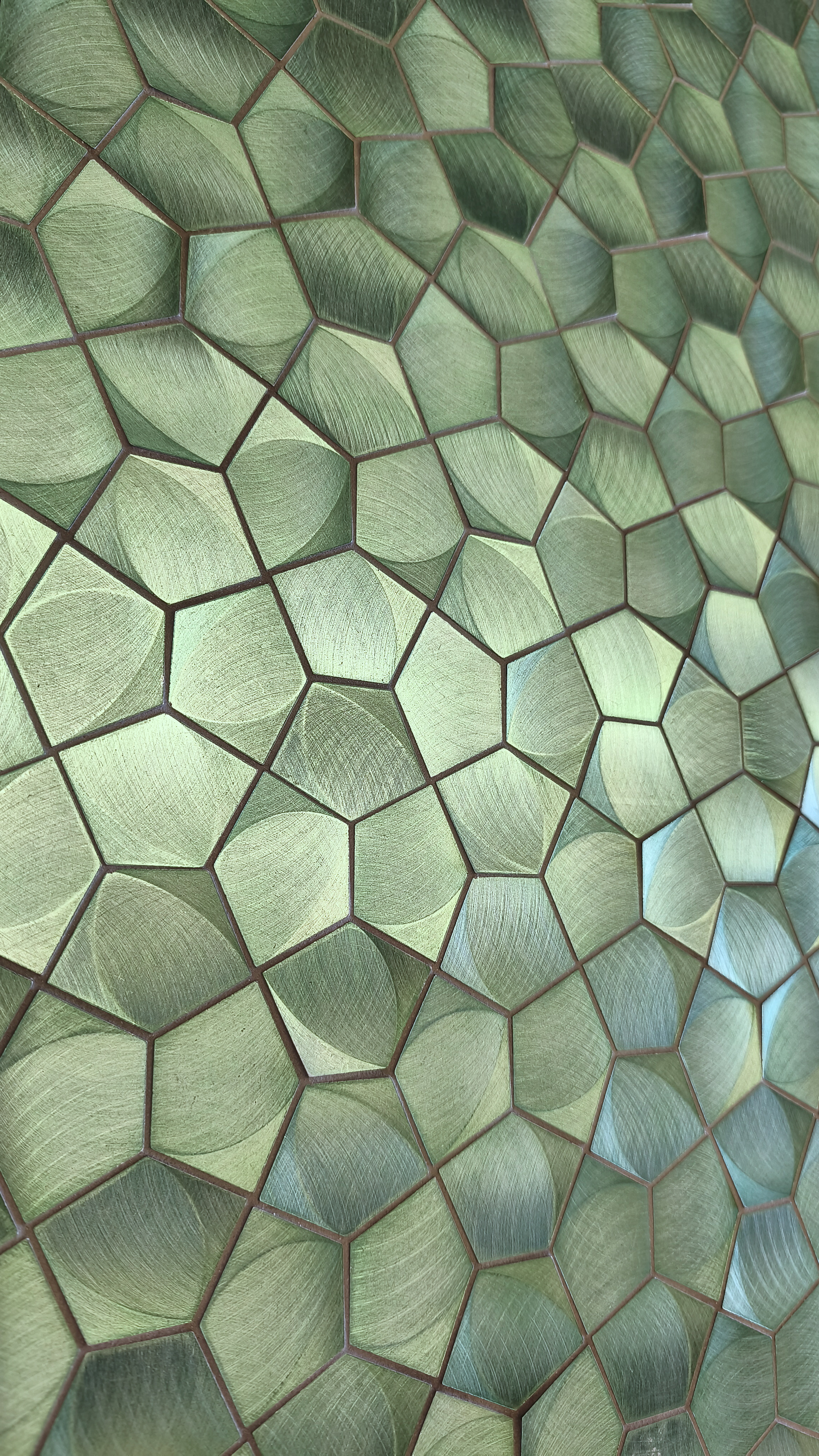 Composée de pentagones aux géométries intérieures apportant profondeur et mouvement, cette mosaïque innovante en aluminium brossé au format 28x28cm constitue une proposition sophistiquée et très actuelle. Sa teinte verdoyante, très tendance, introduit une nuance organique et naturelle qui se transforme avec la lumière, créant des effets changeants et une sensation visuelle enveloppante.