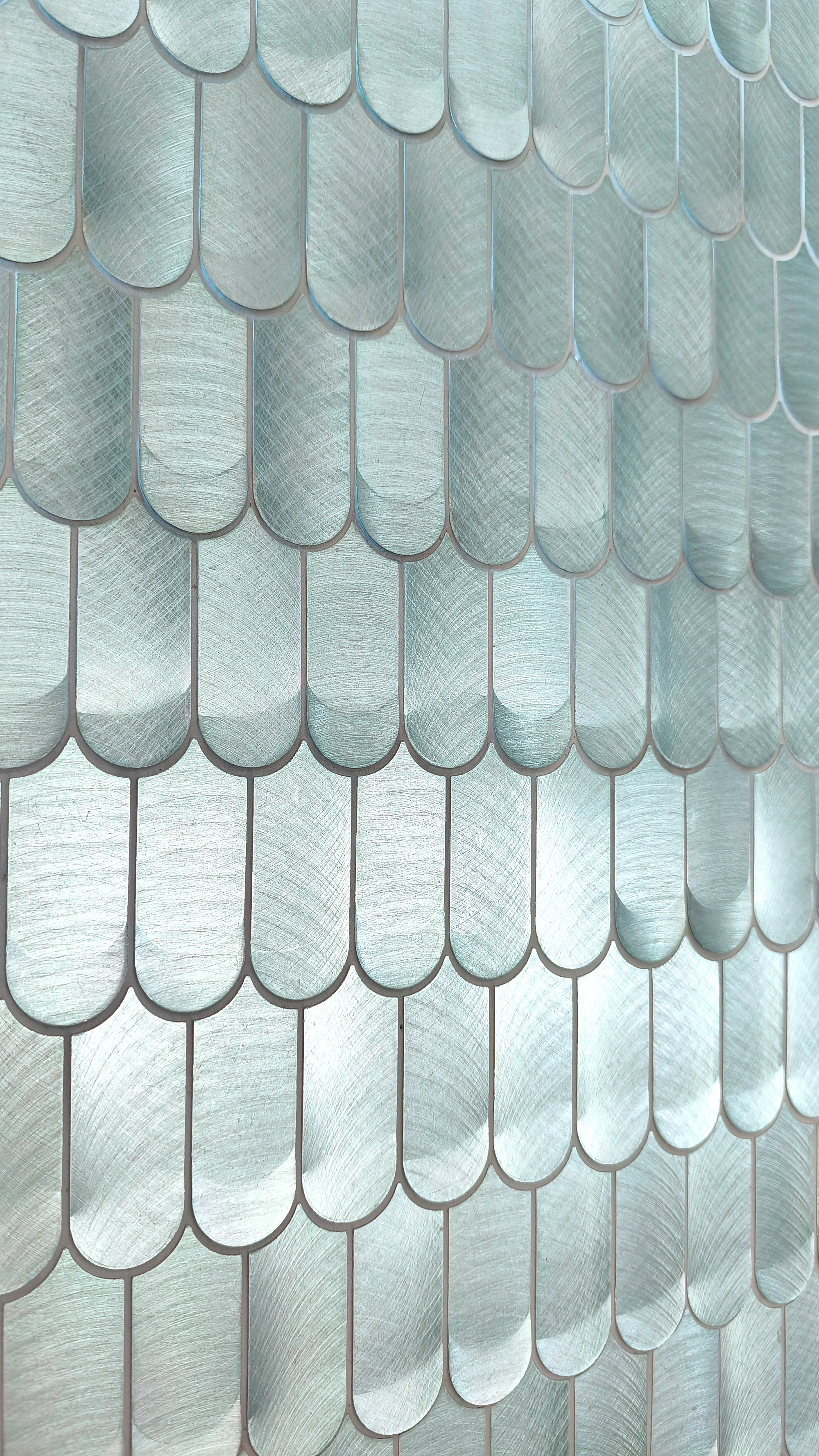 Au format 30,2x31,1cm, cette mosaïque en aluminium métallisé est composée de pièces stylisées en forme d’écailles. Chaque tesselle présente une courbure sur la partie supérieure qui modifie le sens du brossage, créant un effet de mouvement et de luminosité, grâce à un jeu visuel de reflets et d’ombres selon la lumière.