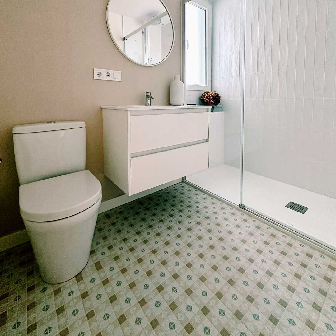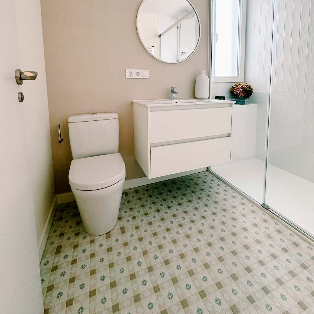 Al ser un espacio reducido, esta siempre acertada combinación ayuda a generar espacios más luminosos y que den la sensación de más amplios, pero también es siempre buena idea apostar por un elemento en la decoración que sea característico y que le aporte ese toque único, especial y personal. Y para eso nuestra serie Mintons es ideal, ya que aúnan tradición y vanguardia rememorando con una estética contemporánea los mosaicos hidráulicos de la época victoriana del S. XIX.
