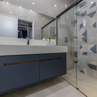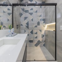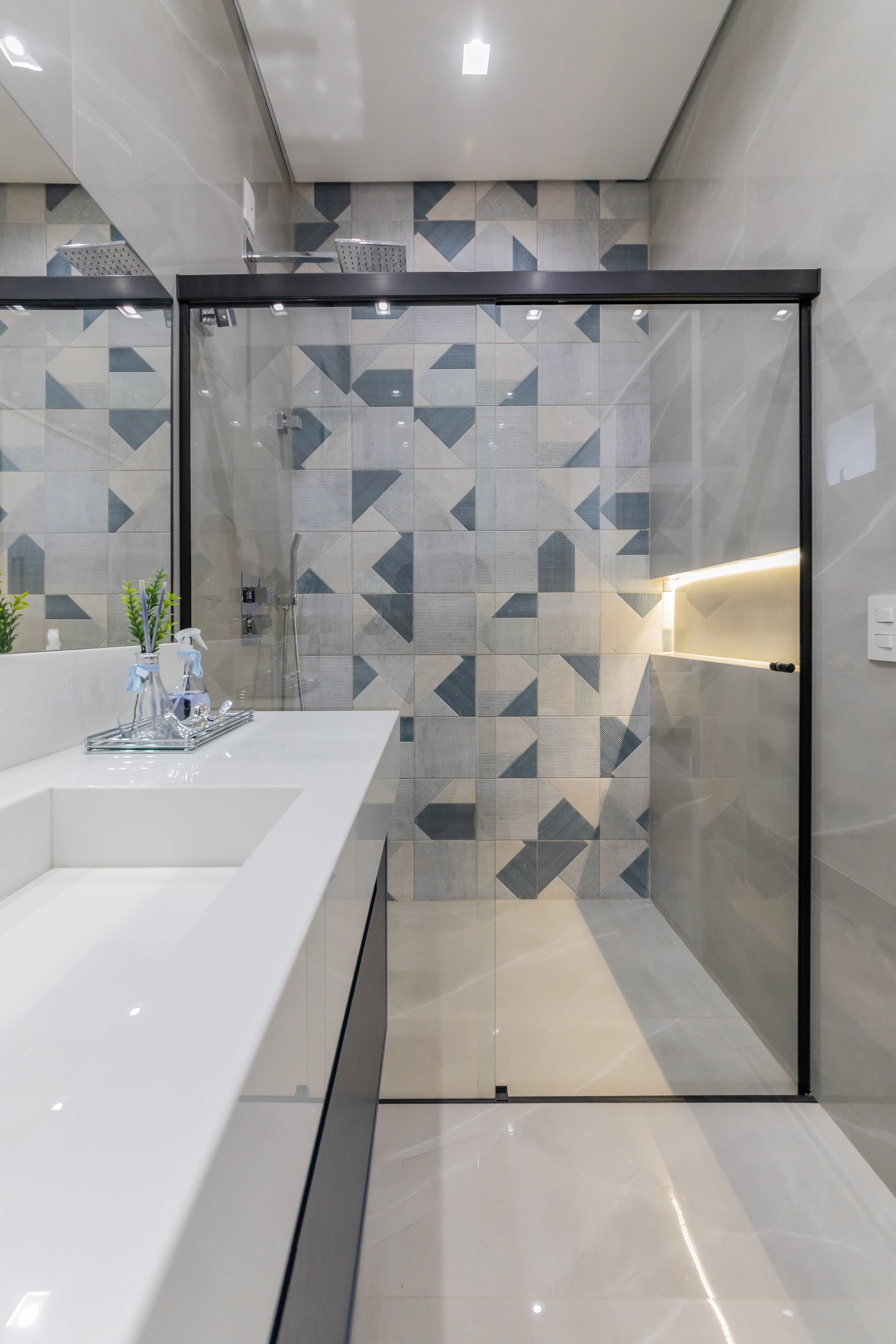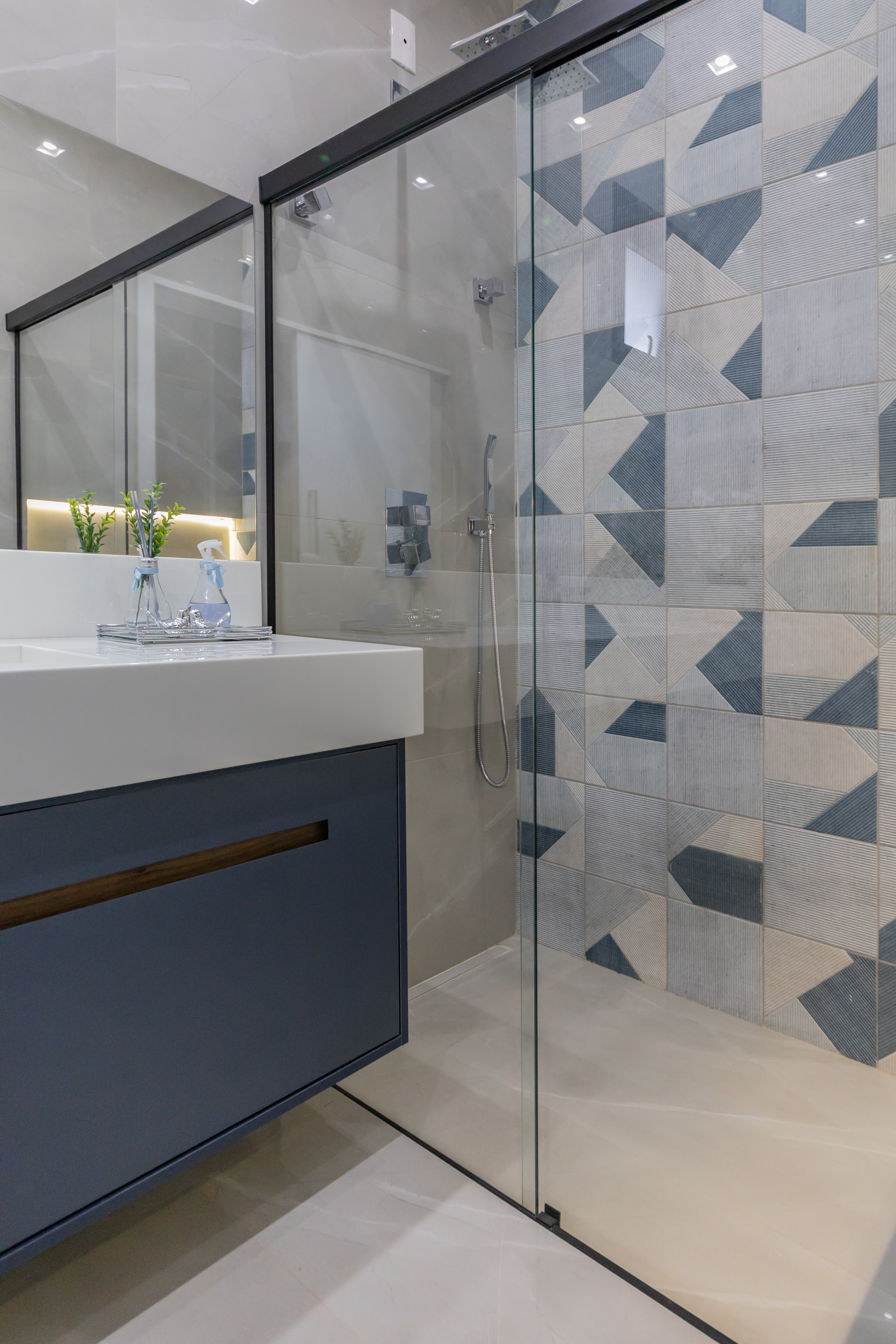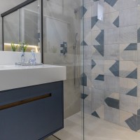 Les designers Marta Rangel et Amanda Miranda proposent une salle de bains très tendance. La texture et la similitude du carrelage avec le denim élèvent la pièce au plus haut niveau.