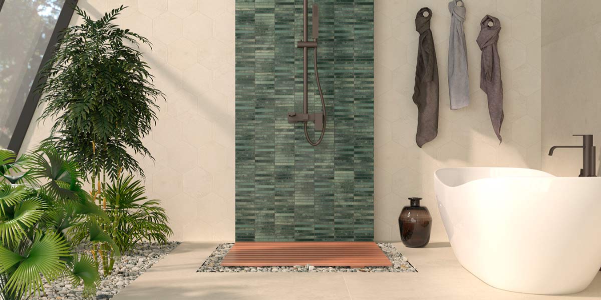 4. Piastrelle beige e verdi: freschezza naturale