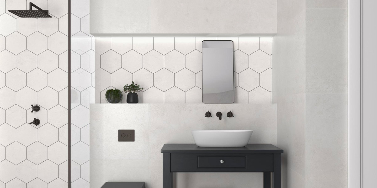 Se volete ottenere un bagno moderno che segua le regole dello stile minimalista, un modo per aggiungere un tocco di dinamismo e ottenere interesse visivo è giocare con i formati delle piastrelle. In questo caso, le piastrelle esagonali sono state inserite nella parete della doccia e nel backsplash dietro il lavabo con l'intento di ottenere un punto focale e un maggiore dinamismo in un bagno votato alla semplicità e all'atemporalità a livello cromatico.