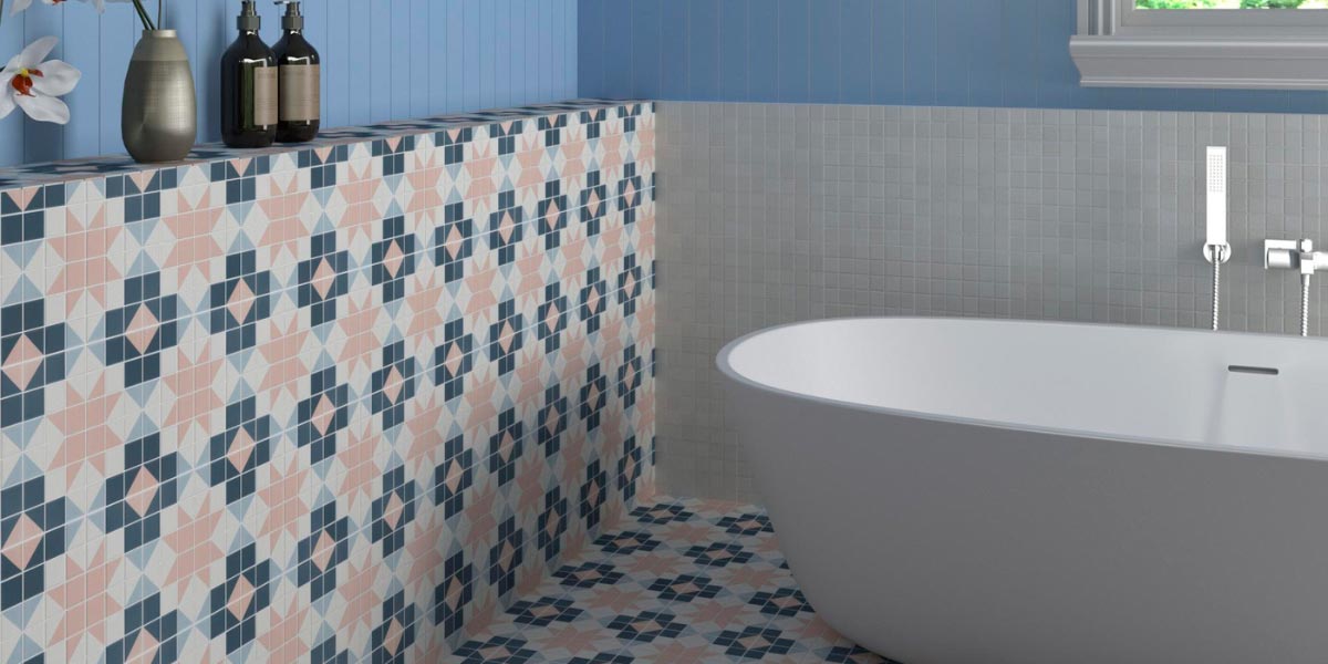 1. Combinazione di piastrelle a tinta unita con piastrelle di ispirazione idraulica