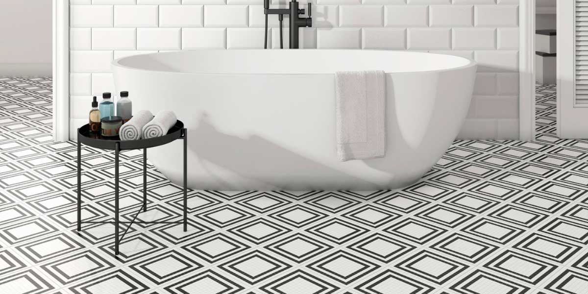 Per ottenere un bagno in cui predomina il glamour, una buona proposta è rappresentata dalle piastrelle con forme geometriche, sia nella combinazione sempre classica di bianco e nero, sia in tonalità vivaci e forti. Ecco due opzioni per combinare le piastrelle geometriche nel bagno con la moderna vasca freestanding.