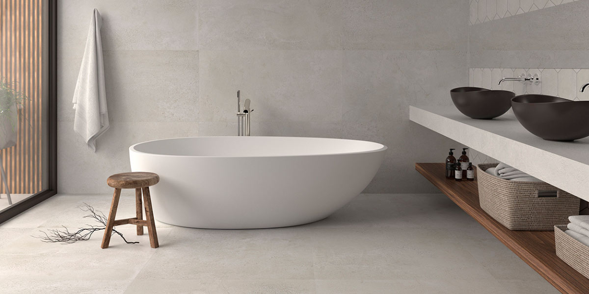 Per chi cerca un approccio minimalista, le piastrelle in gres porcellanato effetto cemento sono la scelta perfetta. Piastrelle in tonalità neutre come il bianco o il grigio e un design semplice e uniforme daranno vita a bagni eleganti e senza complicazioni. La semplicità di questo stile mette in risalto la bellezza della vasca freestanding e crea un'atmosfera serena e rilassante nel bagno.
