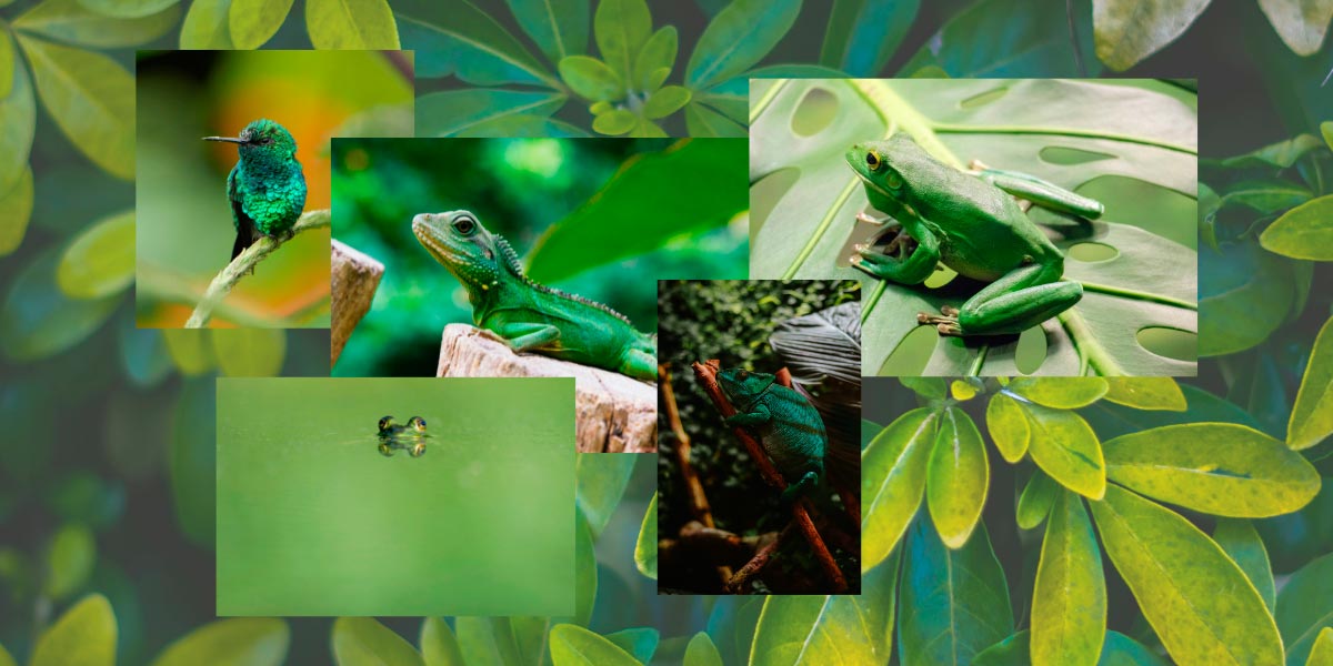 - Fauna: nella fauna, il verde è presente nella pelle di alcuni animali, come lucertole, serpenti, rane, e anche nel piumaggio degli uccelli, come pappagalli e cocorite. Inoltre, ci sono insetti come cavallette, mantidi religiose e bruchi che hanno un colore verde intenso come mimetismo per mimetizzarsi nel loro ambiente naturale.
