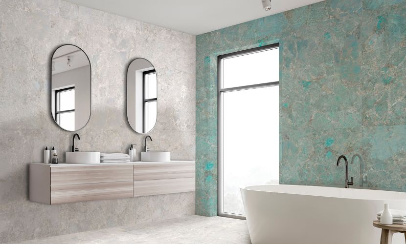 D'altra parte, seguendo le tendenze dei marmi di grande formato, la serie Amazonite è tutto ciò che gli amanti del lusso e della raffinatezza stanno cercando. Le sue tonalità di marmo in verde menta sono perfette per progettare un gres porcellanato che emana stile.