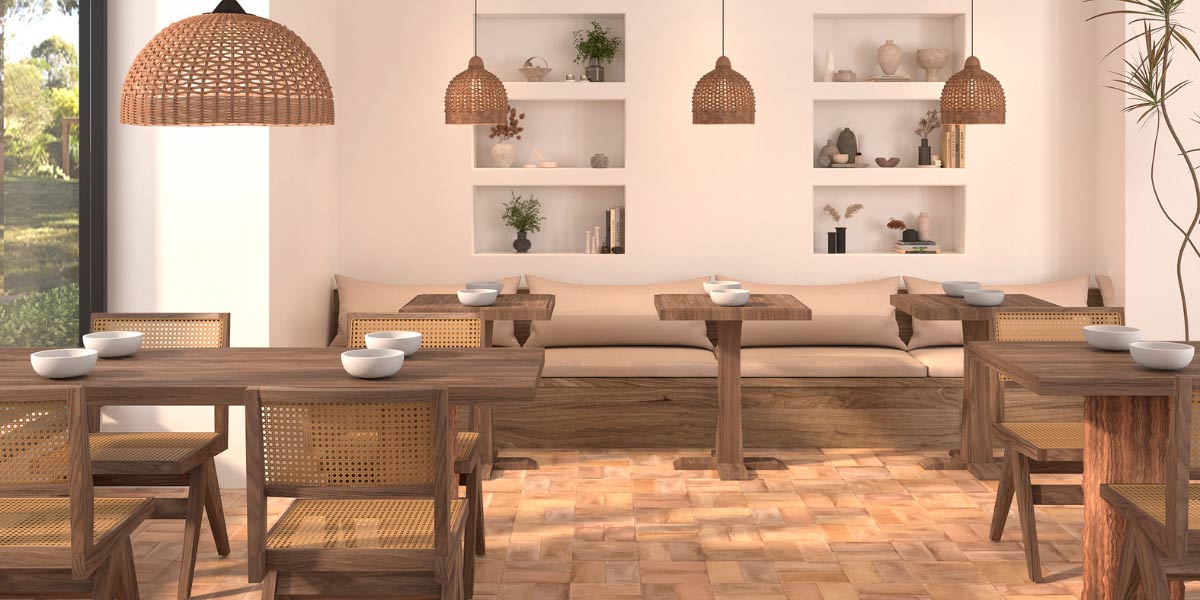 L'estetica del cotto non è solo per la casa. Negozi, caffè e spazi di coworking possono beneficiare del potere emozionale del cotto simulato. Utilizzate le nostre piastrelle in finto cotto per il pavimento e abbinatele a un'illuminazione calda, al verde pensile e ai mobili in rafia per creare uno spazio con personalità, che inviti a soffermarsi e si colleghi ai valori di sostenibilità e autenticità.