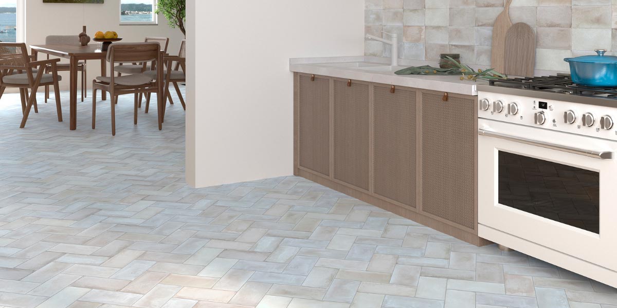 Oltre al tradizionale stile rustico, l'estetica mediterranea può essere reinterpretata con linee pulite, proporzioni contemporanee e dettagli artigianali. Combinate le piastrelle Xàbia sul pavimento di una cucina open space con scaffali in legno massiccio, ceramiche bianche smaltate o con motivi mediterranei e piani di lavoro in pietra. Il risultato è uno spazio luminoso e moderno che ricorda le case ibizenche o toscane, ma senza ricorrere a eccessi decorativi.