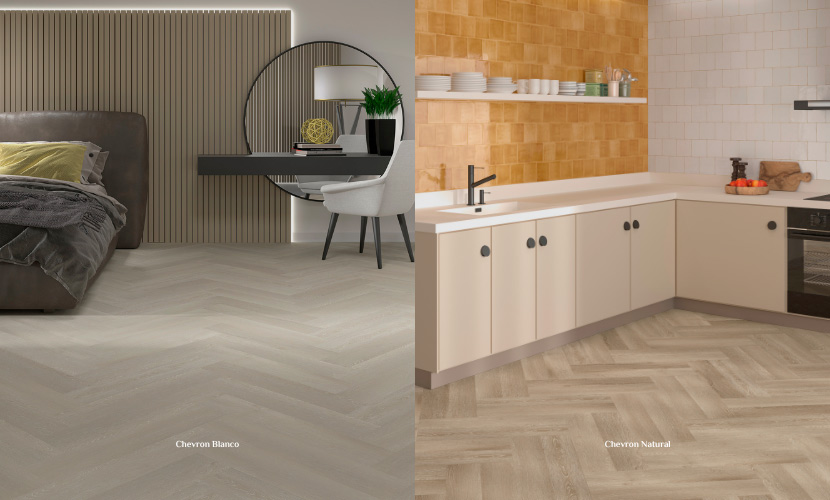 Chevron è la nostra proposta di pavimento in vinile SPC più piccola per pavimenti a spina di pesce, molto tipici del parquet classico. Si distingue per le sue tonalità chiare di legno scrostato, con i suoi nodi biancastri, ideale per creare spazi caldi e accoglienti. Disponibile in due colori: Blanco e Natural.