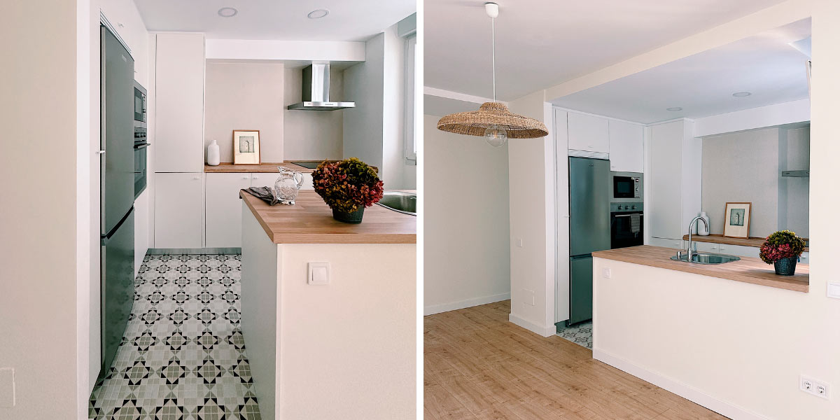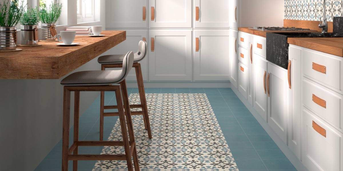 3.- Tappeto ceramico in aree delimitate. Crea un “tappeto” visivo con piastrelle idrauliche in zone strategiche, come davanti al lavello o alla zona cottura. Circondato da un pavimento neutro, questo dettaglio aggiunge stile e praticità senza confusione visiva.