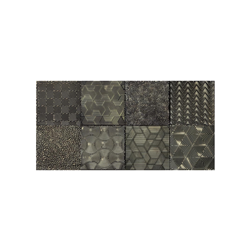 Il catalogo di Dune ha un'ampia varietà di piastrelle con finto bronzo, sia rilievi che mosaici multicolori per spazi come bagni, soggiorni e cucine.