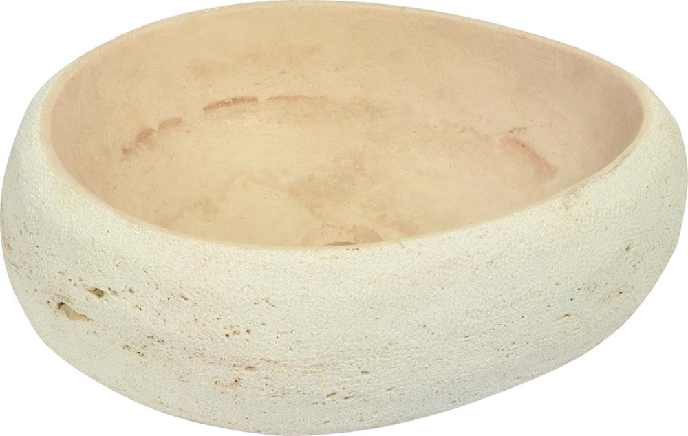 Asymmetrical, natural travertine basin. Design suitable for both modern and classical settings, bush-hammered exterior and smooth, distressed interior.