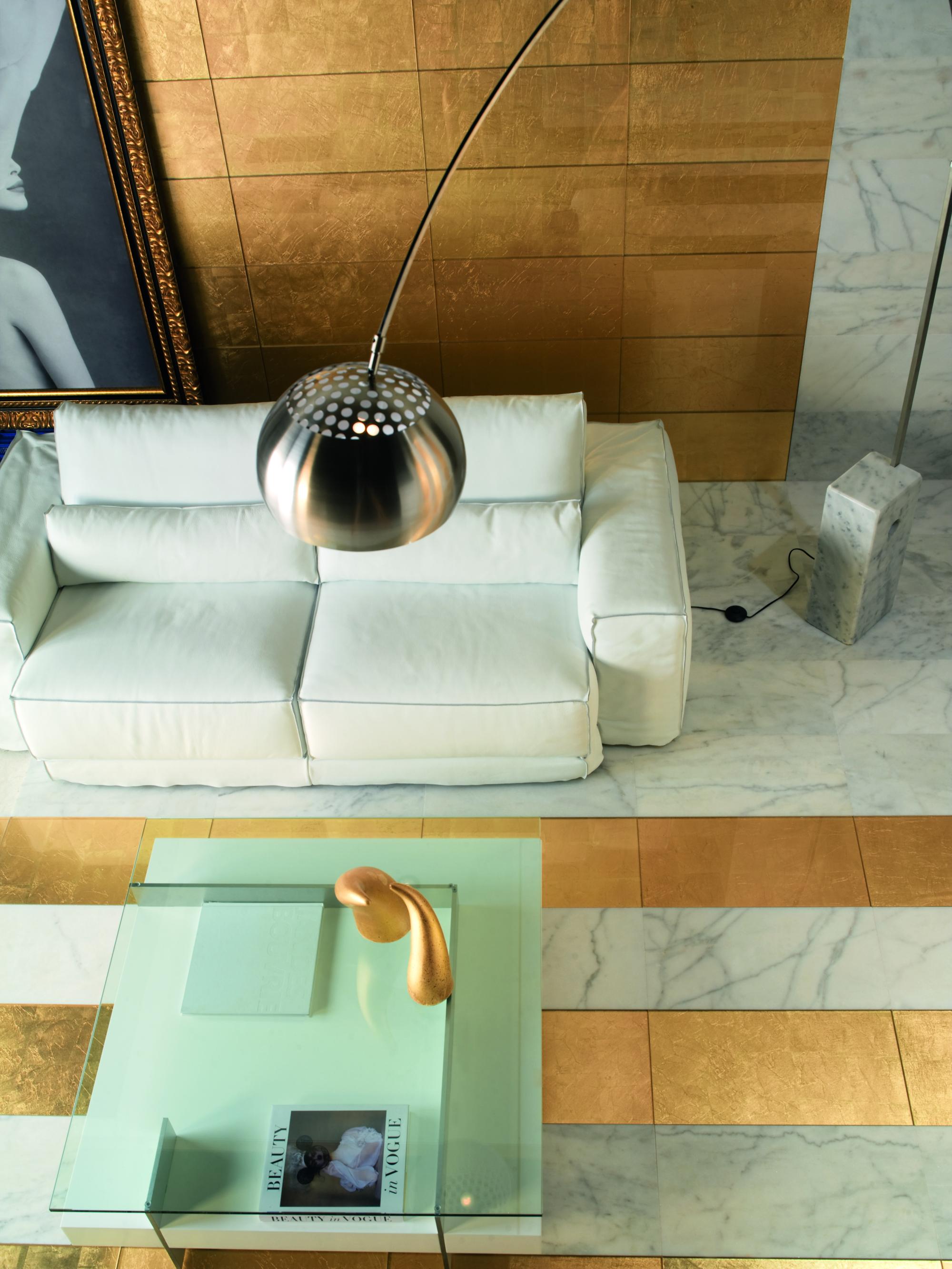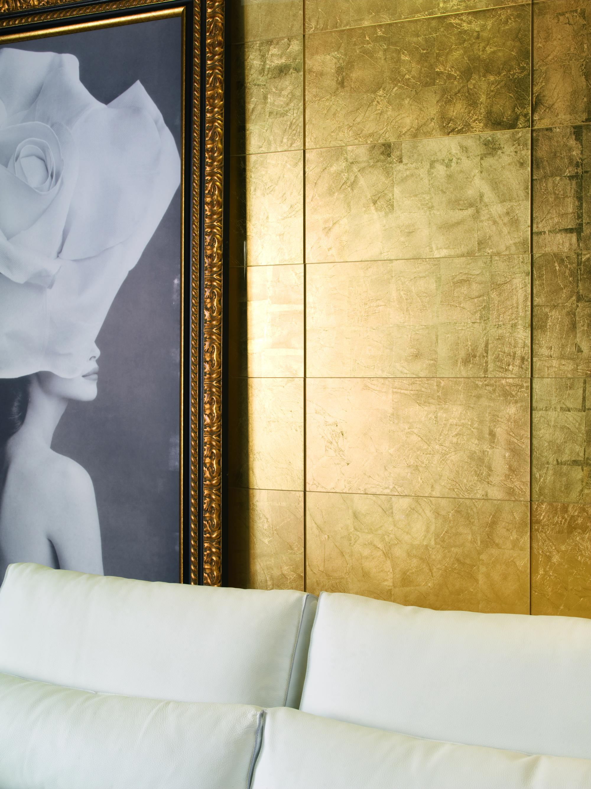 Impressive glass washbasin laminated in gold leaf to match the Pan de Oro tile.